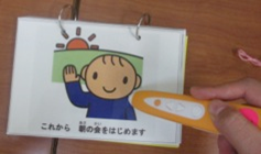 1.言葉を話すことが難しい児童生徒が日直などで司会を行い、クラス・集団の一員として活動に参加する。 2.二択以上の選択肢を出し自分が言いたいこと・伝えたいことを選択する。 3.音声を聞いて正しい発音で話す練習をする。 |