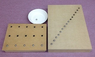・穴の径の大きさは玉の径と同程度にすることで、玉を押すとある程度の触覚的な抵抗がうまれるようにする ・本教材を机上に置き、動かないようにマット等を敷いて固定して行う・児童の身体の中心(へそ)と教材の位置とに配慮する ・児童の発達段階に応じて、自分で玉を並べたり片付けたりすることも働きかけるようにする ・児童の発達段階に応じて、本教材の構造を児童が触ったり操作したりして理解できるようにする |