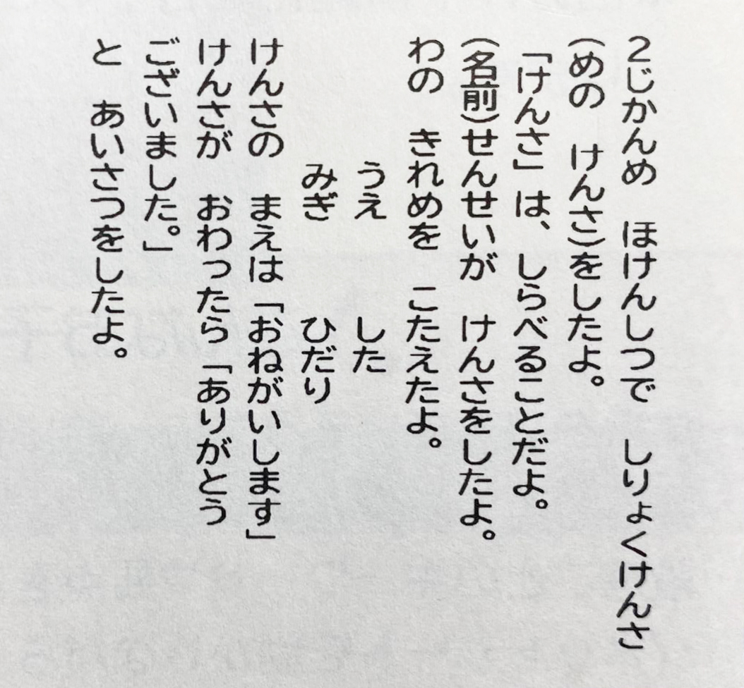| 使い方 | 本教材は、朝のトピックスの時間に話し合われた内容について、言葉の一部を○にし、児童に家庭で穴埋めをさせるための家庭学習用のプリントである。その日の予定や行事、季節に関する事等、その時々で指導が必要と思われる事柄について話し合った内容を簡単にまとめたものである。その日、話し合われた事柄の中で、年齢相応に身につけておいて欲しい言葉について、文字の一部を○にし、その部分を児童に書かせるようにしている。○一つがひらがなや数字1文字に対応している。 家庭では、単に穴埋めをするだけではなく、本教材を手がかりにし、学校で話し合われた事について、それぞれの児童の実態に合わせ、より内容を深めたり拡げたりして頂くよう、保護者には依頼している。 また、虫食いにする言葉は、その後の児童の学習内容とも関連付けて選択して取り入れておき、児童が教科学習に円滑に取り組めるよう、押さえる言葉を吟味している。本教材であれば、「みぎ」「ひだり」の言葉→算数の「なんばんめ」の単元との関連で。「ありがとうございます」「あいさつ」の言葉→国語の「あいさつ」の単元との関連で。 |