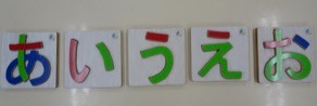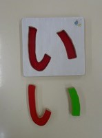 ①平仮名の型の中を指でなぞり確認する。 ②平仮名の書き順にそって、木製の木片パズルを一つずつ提示する。 ③全ての木片パズルがはめることができたら、木片パズルの上に指でなぞるように促す。 ※木片パズルの上は、赤、緑、青、黄色の書き順を示したシールが貼ってある。 |