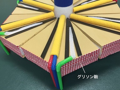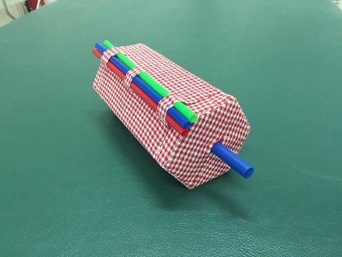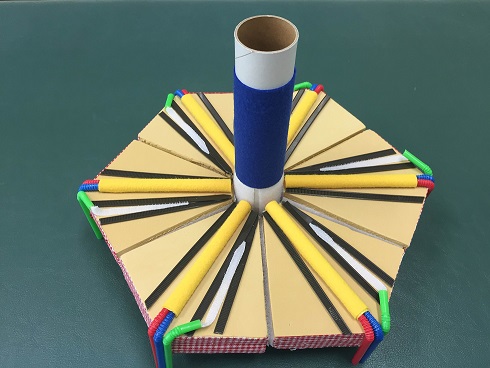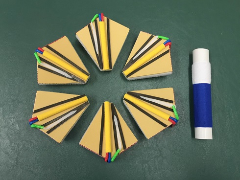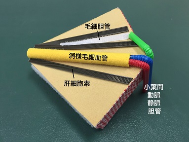 肝臓の微細構造は墨字の教科書では図で表されているが、細かい情報まで載っていることも多く、大まかに理解しにくい場合がある。また、名称の似ている部位が多いため、生徒は混乱を生じやすい内容である。 この教材ではまず、肝臓を構成する最小単位である肝小葉の形状を大まかに捉え(img005)、その次の段階として、肝小葉の拡大版を使用する。肝小葉は6つに分割することができるので、六角柱の形状(img005)を生徒に理解させたあと、生徒ひとりひとりに教材を配布し、教員の説明と同時に部位の確認をすることもできるよう工夫した。また、生徒の触っている部位を見ることで、内容を理解できているかどうかを確認することも可能である。 動脈、静脈、胆汁の通る管はそれぞれ色や触感、太さを変えてあるため、弱視・全盲に関わらず、すべての生徒が同時に個人的に学習できるよう配慮した。 |