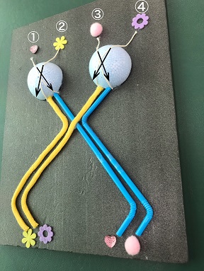 教材全体の素材や色合いに変化をもたし、さらに、凹凸をはっきりさせることで弱視・全盲の生徒がともに理解しやすい教材とした。 視覚の経路をたどることで、その途中のどこかに障害が起きた場合、どこの視野が欠損するかを生徒自身が考え、理解できるよう、視覚の経路の始めと終わりの部分に同じマークをつけた。 |