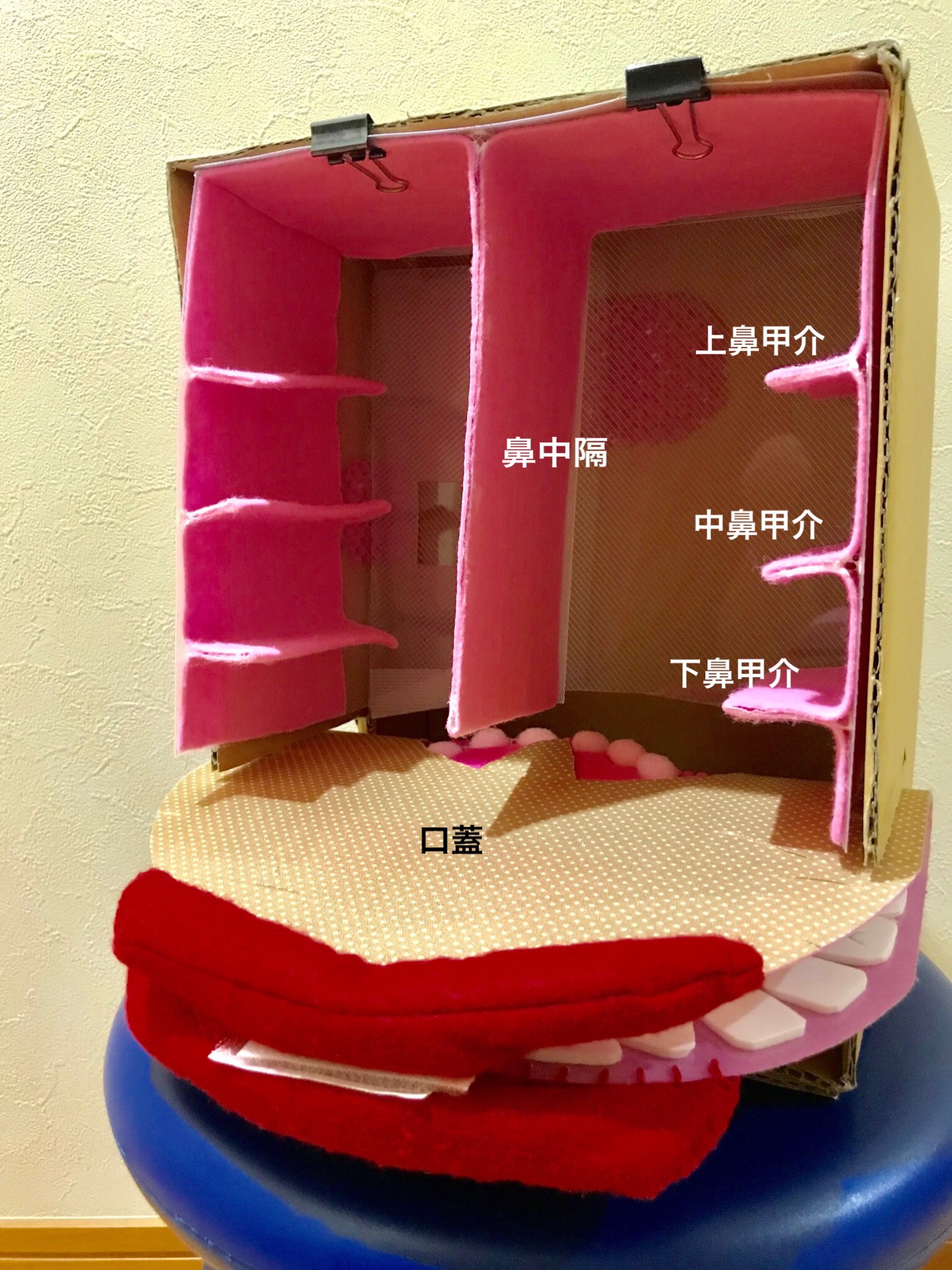 ①教材を配布し、一定時間、生徒に観察させる。 ②鼻腔、口腔、咽頭の教材をバラバラにし、それぞれの特長について説明する。 ③鼻腔、咽頭、口頭の教材を結合させ、それぞれの位置関係ついて説明する。 ④鼻腔を取り外し、ワルダイエルの咽頭輪を構成する扁桃の位置について説明をし、輪状に取り囲んでいることを理解させる。 |