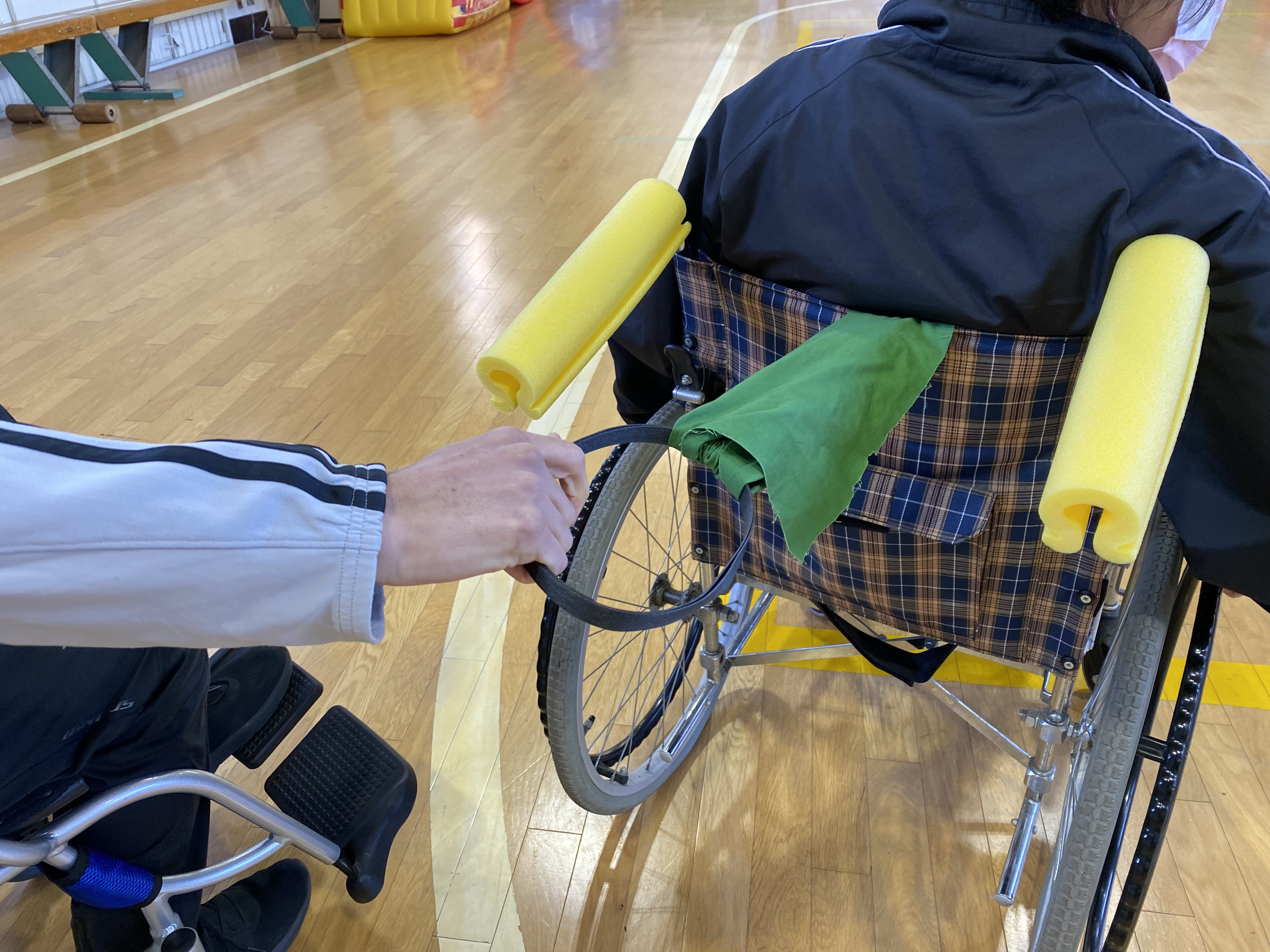 ・バックルを付けて、ベルトの長さを調整する。ベルトの余りが長い場合は結んで車いすのホイール等に巻き込まれないようにする。 ・マジックテープでしっぽを付ける。 発案者は、本教材を用いてコートの中でしっぽを捕りあう「しっぽ取りゲーム」を行ったが、鬼ごっこや、島わたり等、対象児童生徒に合わせた展開が考えられる。 |