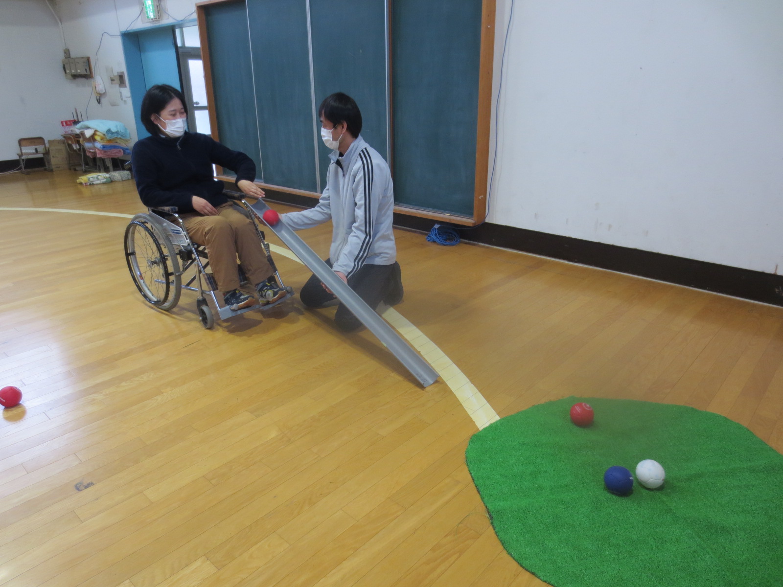 ・投球の力が弱くボッチャボールの操作に困難がみられる場合、この支援道具を勾配具として活用することで競技がしやすくなりま す。 |