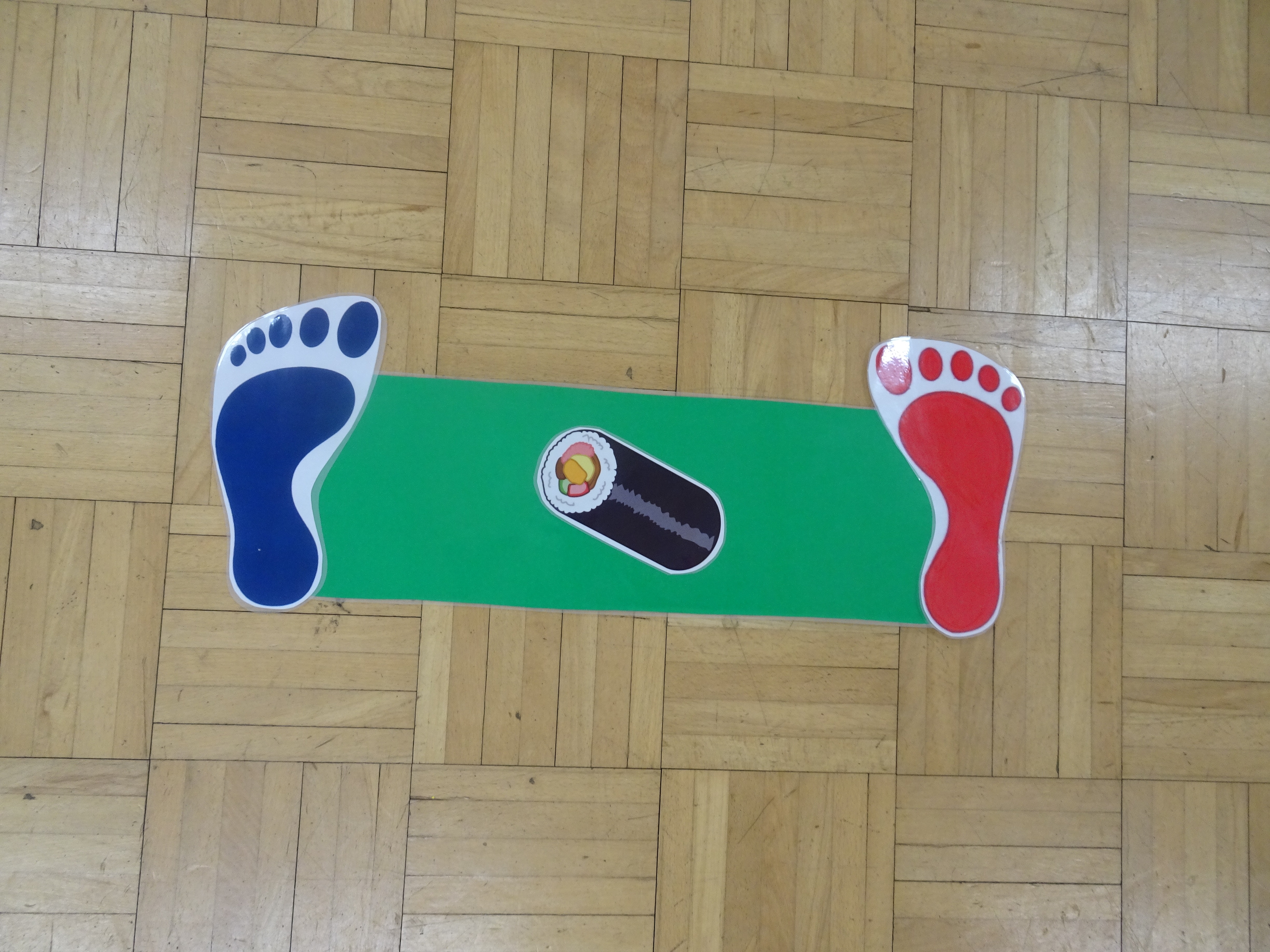1.床の上に「サイドステップ練習ボード」を貼り付ける。 2.まずは、足形へ足をのせ、両手を広げて体重移動し「サーフィン」の真似をしてウォーミングアップする。 3.「右足を左足の隣にくっつけます」と手本を示しながら伝える。 4.続いて、右足で足形を踏み「左足を右足にくっつけます」と示範する。 5.真ん中の食べ物(お寿司)を踏まないように伝え、「お寿司踏まない」のかけ声に合わせて、左からスタートする。 6.「お寿司踏まない」のかけ声で上手になったら、曲に合わせてレッツダンス♪ |