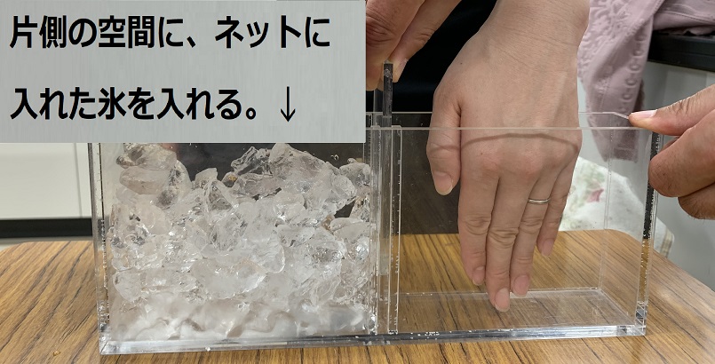 ・冷やされた空気が下降することを、実験教材の触察(触覚による観察)を通して理解する。 ・温められた空気が上昇し、冷やされた空気が下降することを、温水と冷水を用いた実験教材の触察(触覚による観察)を通して理解する。 |