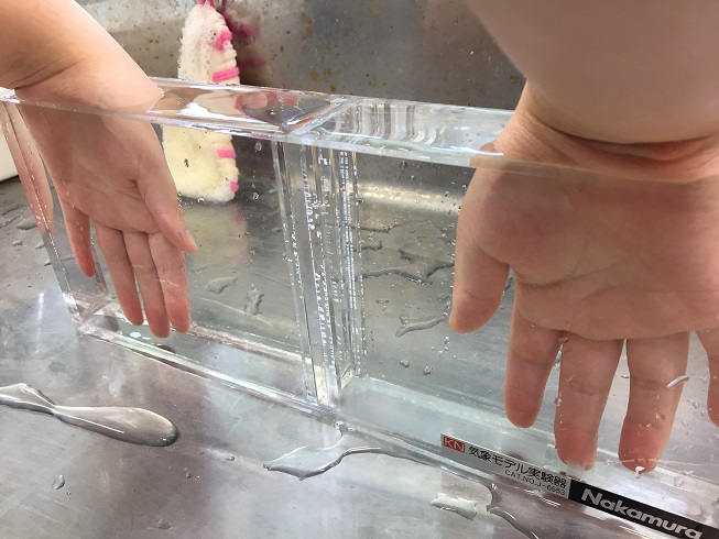 市販の前線モデル実験器(以下、実験器とする。)と、氷(寒気のモデル)を用い、以下の手順で行う。 【冷やされた空気が下降することを確かめる実験】 ① 実験器の中央に、仕切り板を差し込む。図のような排水溝ネットに小さな氷をいっぱいに入れ、片側の空間に置く。(排水溝ネットに入れると、③で仕切り板を取り外しても氷が隣の空間に崩れ落ちない。)氷による冷気は、寒気のモデルである。 ② 図のように、氷を入れていない方の空間に、指先が底につくように片手の手のひらを差し込む。このとき、手のひらは実験器の内壁に触れないようにする。(内壁に触れていると、その感触が手のひらに伝わり、③以降で温度の変化が分かりづらくなる。)こちらの空間の空気は、暖気のモデルである。 ③ 中央の仕切り板を取り外すと、指先で冷気(寒気のモデル)を感じることができる。しばらくすると、指先から指の付け根に向かって、冷気が上がってくることが分かる。 ④ 手のひらを5㎝程度、静かに持ち上げ、数秒間静止した後に、再び底に向かって静かに下ろす。持ち上げた時には冷気(寒気のモデル)を感じることはできないが、下ろした時には差し込んだ手のひらの下半分(指先)で冷気を感じることができる。 ⑤ ③、④の体験から、冷気(寒気のモデル)が隣の空間の空気(暖気のモデル)と接すると、冷気は下方へ、空気は上方へそれぞれ移動することを、手のひらで感じる温度で理解することができる。 【温水と冷水を用いて温められた空気が上昇し、冷やされた空気が下降することを確かめる実験】 ① 実験器の中央に仕切り板を差し込む。仕切り板で区切った片側の空間に温水(暖気のモデル)を、もう一方の空間に冷水(寒気のモデル)を入れる。なお、温水として40℃弱の湯を使ったが、生徒に確認しながら適切な温度を設定する。冷水は水道水をそのまま使う。 ② 温水(暖気のモデル)を入れた空間に片手を、冷水(寒気のモデル)を入れた空間にもう一方の手を入れるよう、生徒に指示する。このとき、指先が実験器の底に着くまで入れるようにする。 ③ 中央の仕切り板を取り外す。 ④ 温水(暖気のモデル)側に入れた手は、指先が冷たく感じられる。また、冷水(寒気のモデル)側に入れた手は、手の付け根が温かく感じられる。生徒はこの変化に驚いて、思わず状況を説明しそうになるが、未体験の他の生徒に分からないように、ここではまだ話さないように指示する。(生徒が一人の場合には、もちろん、詳しく状況を説明してもらうとよい。) ⑤ 短時間後に、温水(暖気のモデル)側に入れた手は、指先から指の付け根に向かって徐々に冷水(寒気のモデル)が上がってくることが分かる。また、冷水側に入れた手は、手の付け根から指の付け根に向かって徐々に温水が下がってくることが分かる。 ⑥ 手のひらを、水がかき混ざらないように静かに5㎝程度持ち上げ、数秒間静止した後に、再び実験器の底に向かって静かに下ろす。持ち上げた時には、指先で温水(暖気のモデル)の温かさを感じるが、下ろした時には指先で冷水(寒気のモデル)の冷たさを感じられる。 ⑦ ②~⑥の体験から、温水(暖気のモデル)が冷水(寒気のモデル)と接すると、冷水は下方へ、温水は上方へそれぞれ移動することを、手のひらで感じる温度で理解することができる。 |