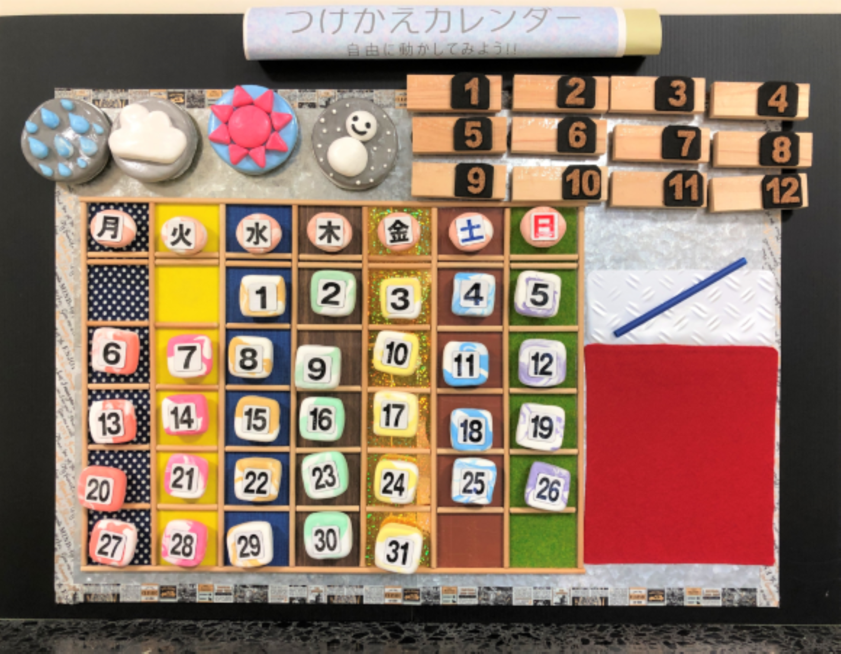 障害特性に対する配慮点 ・盲児童も活用できるよう月日・曜日には点字をつけている。