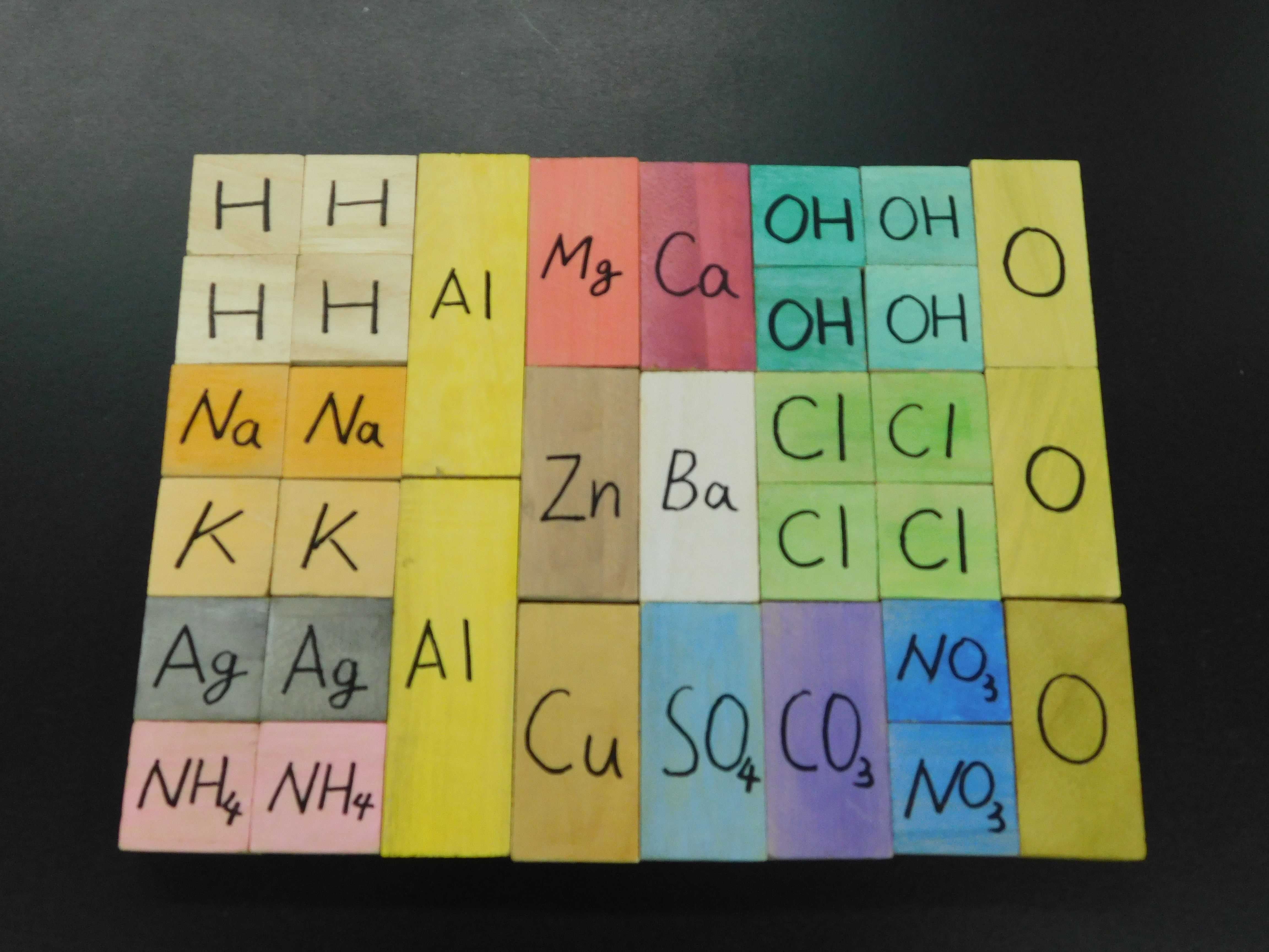 ・イオン価がイメージしにくい生徒,イオン価と組成式の関係が曖昧な生徒に対し,イオン価を明示したイオンモデルを利用することで,イオン価と組成式の関係を明確にし,イオン価を基とした組成式や化学反応式の組み立て方を理解しやすくする。 ・立体的に物を捉えることが難しい生徒に対し,市販の立体的な分子模型でなく,平面的に扱えるモデルを利用することで,モデルを利用して考えることに対するハードルを下げる。 ・磁石のN極を陽イオン価,S極を陰イオン価として埋め込むことで,陽イオン同士,陰イオン同士では結合しないことを感覚的に理解しやすくし,電気的に中性という意味を捉えやすくする。また,複数の原子モデルをまとめたモデルを1つのものとしてとらえやすくする。 ・磁石を,陽イオンは右,陰イオンは左に埋め込むことで,完成したモデルがそのまま組成式になるようにする。 ・視覚障害においては,元素記号を彫刻などすることで,モデルの表す原子を把握しやすくする。 |