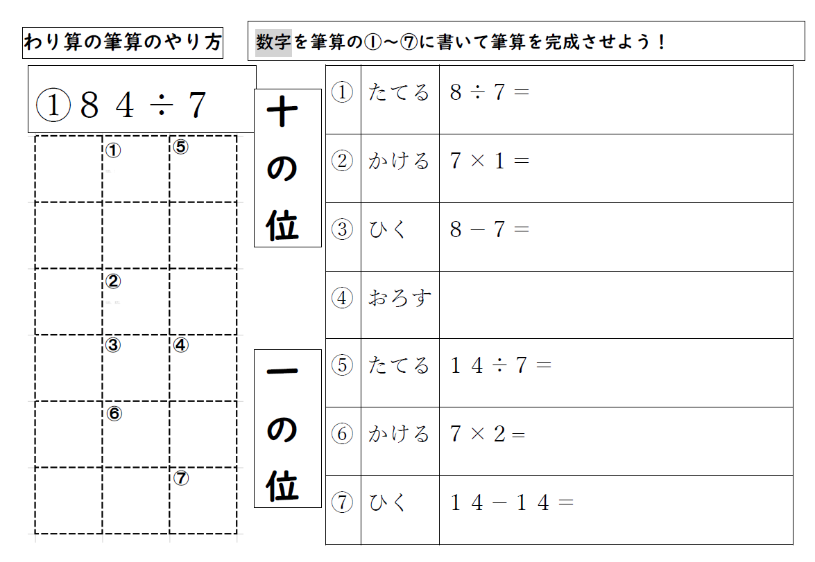 | 期待される効果及び成果 | ・手順表にそって筆算を行うことで、筆算の手順が正しく身に付き、慣れることができます。また慣れるに従って、本教材がなくても自分でノートやプリントに必要な補助線を引きながら筆算をすることができるようになります。 |