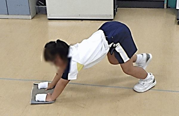 ・高這い、雑巾がけの正しい姿勢をとる。 ・力を入れて前に進む。 |