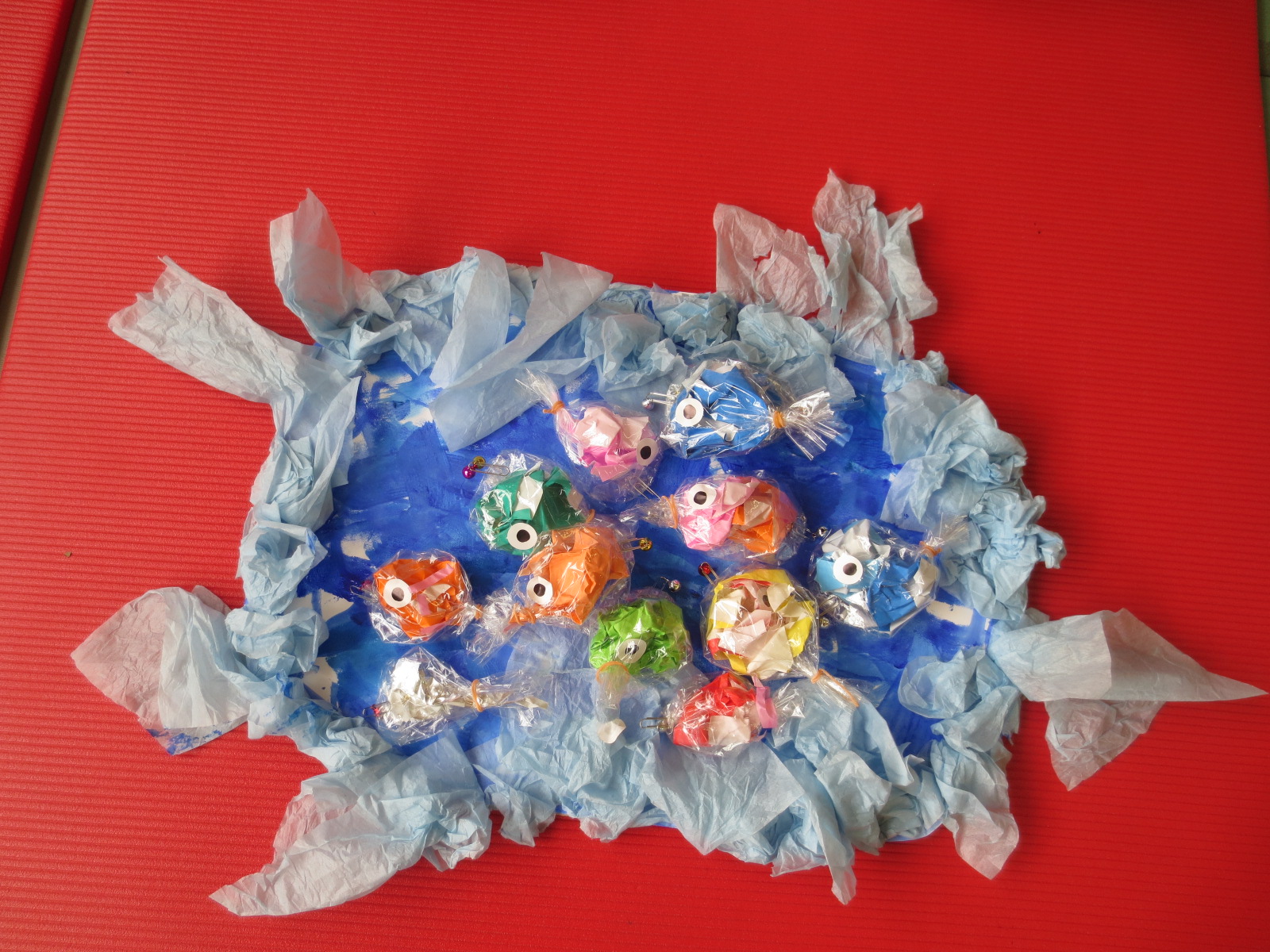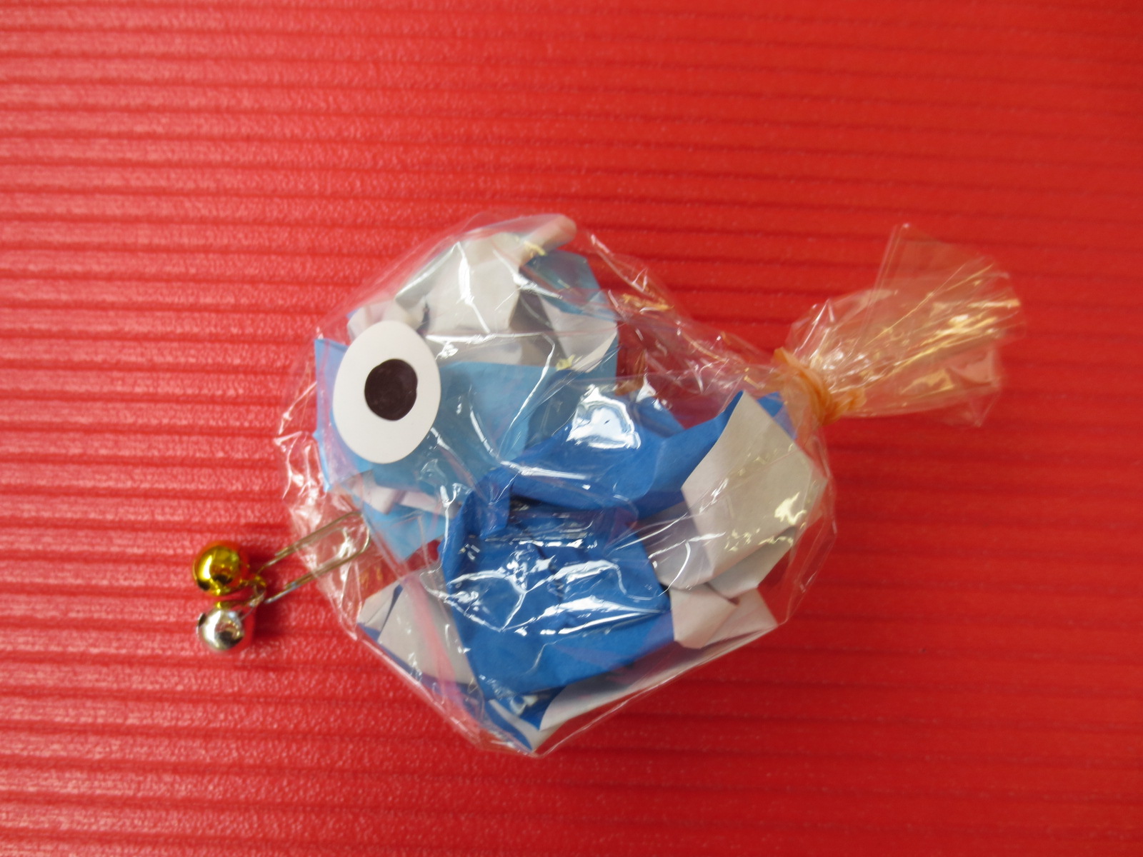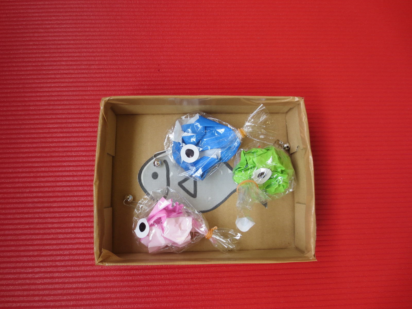 <材料> 【池】段ボール、画用紙、絵の具、花紙 【魚】折り紙、輪ゴム、ラッピング袋、クリップ、すず 【さお】ストロー(カラフルな魚を引き立てる為、さおは目立たない方がいいです。色は黒がおすすめです)、タコ糸、マグネット(小さくて強力なもの。100円均一ショップで手に入ります) 、ティッシュ、黒いビニールテープ <作り方> 画用紙に絵の具で好みの色をぬり、池を作ります。花紙を池の周りに貼り、石垣を作ります。 魚を作ります。折り紙を小さくまるめて、ラッピング袋で包み、輪ゴムでとめます。袋の先に、クリップと小さいすずをつけます。 さおを作ります。ティッシュをにぎりやすい形にまるめて、ストローにビニールテープで巻きます。ストローの先にタコ糸をつけます。タコ糸の先に、マグネットをつけます。 <使い方>池に魚を並べて、さおで魚を釣ります。自分が「魚屋さん」、友達に「お客さん」になってもらう等、授業のねらいに応じて使用してください。 授業のねらいに応じて、お金や箱を用意しても良いでしょう。 |