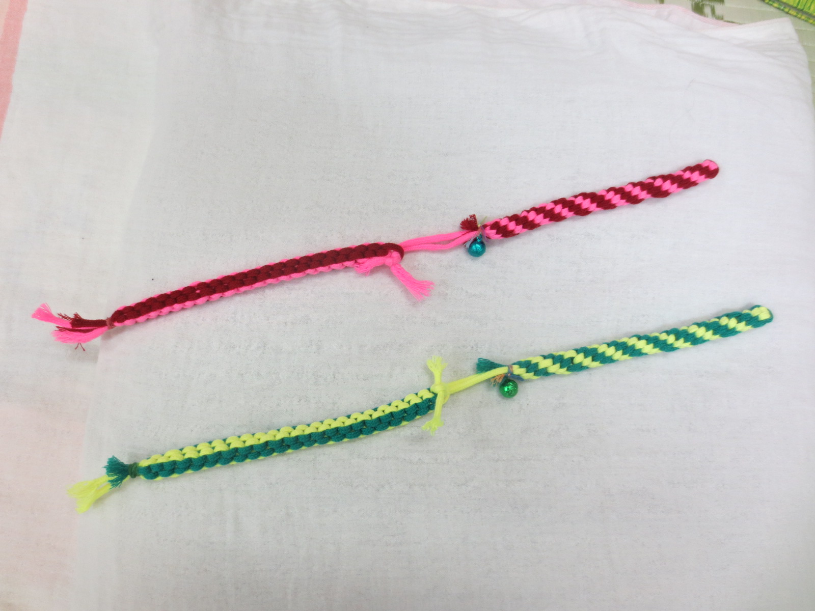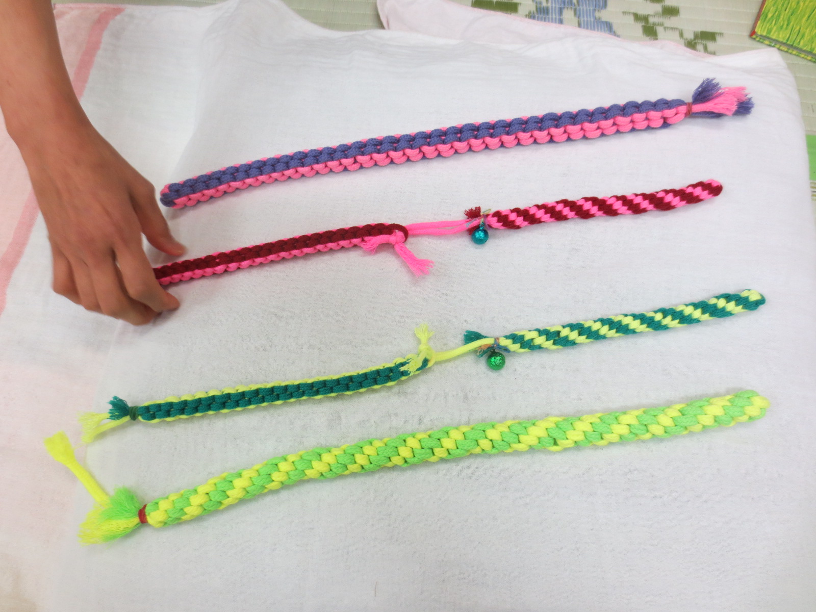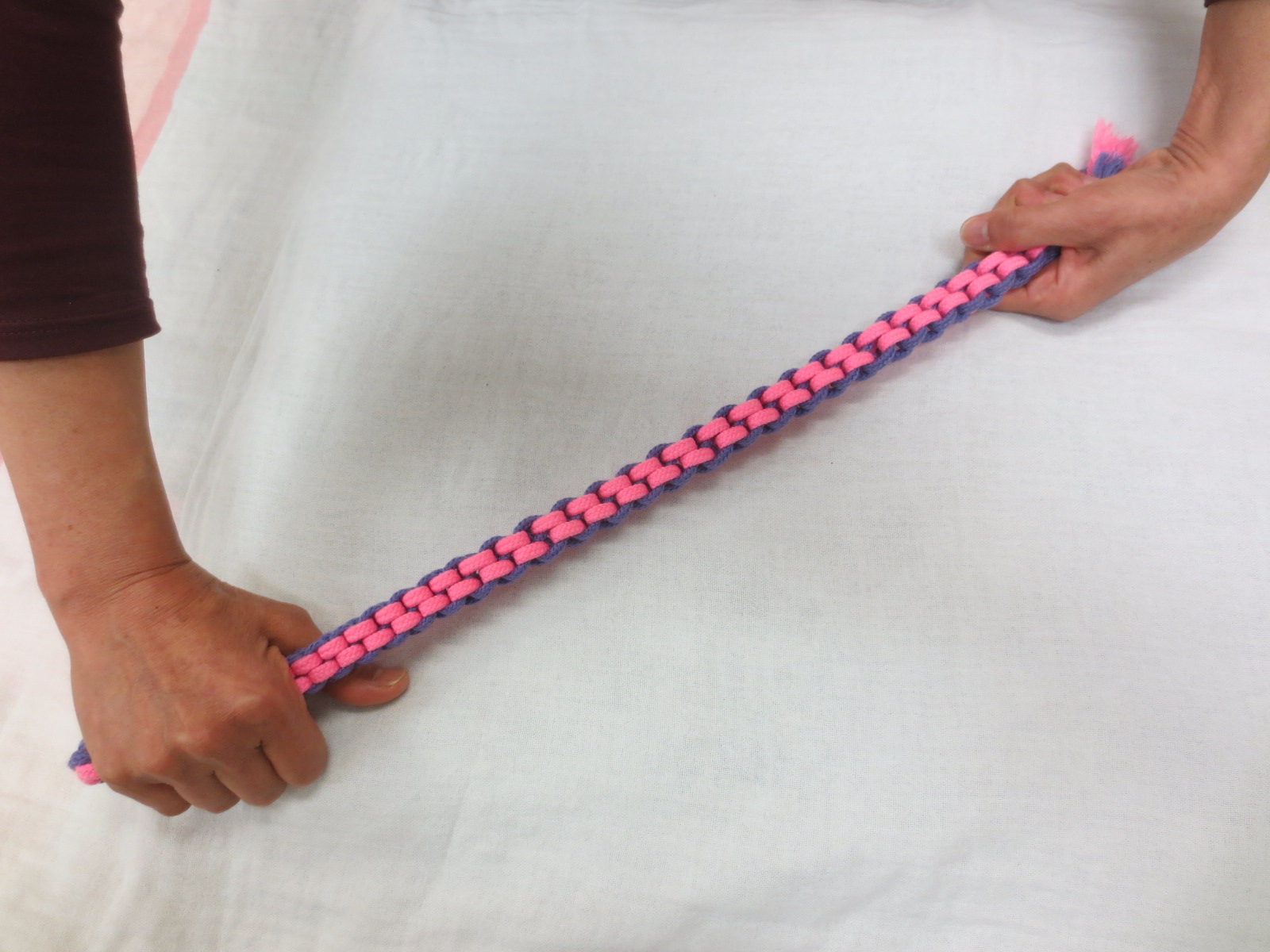 【材料】 ・綿コード(*巾着やナップザック作りなどに利用するときのひも) *色や太さが違うものを数種類用意するとよいでしょう。 *100円均一ショップや手芸店等で扱っています。 ・輪ゴム ☆彡お子さんの好みや必要に応じて ・鈴(小さいサイズのもの。優しい音色のものがおすすめです) 【作り方】 ①綿コード2本を重ねて結びます。 色や太さを変えることで、目で捉えやすくなり、触感も楽しむことができます。模様(色の重なり方)やにぎったときのフィット感を確かめながら、作ってみてください。 ②端まで編んだら、輪ゴムでとめます。 ③鈴をつけると、ひっぱったときに可愛らしい音色が楽しめます。 【使い方】 お子さんにひもを持ってもらいます。手指の力が弱いお子さんや緊張が強いお子さんの場合には、にぎりやすいように、支えてあげてください。「みんなで にぎにぎ にぎにぎ」「ひっぱりっこ~」などと声をかけながら、お子さんとやさしくひもをひっぱりあいます。国語の学習でも活用できます。 しっかり握っていると、ひもの伸び縮みも感じられます。また、二つを軽く結んでおくと、引っ張ったときに外れる遊びにも展開できます。 授業のねらいに応じて、使用場面や声かけを工夫してみてください。 |