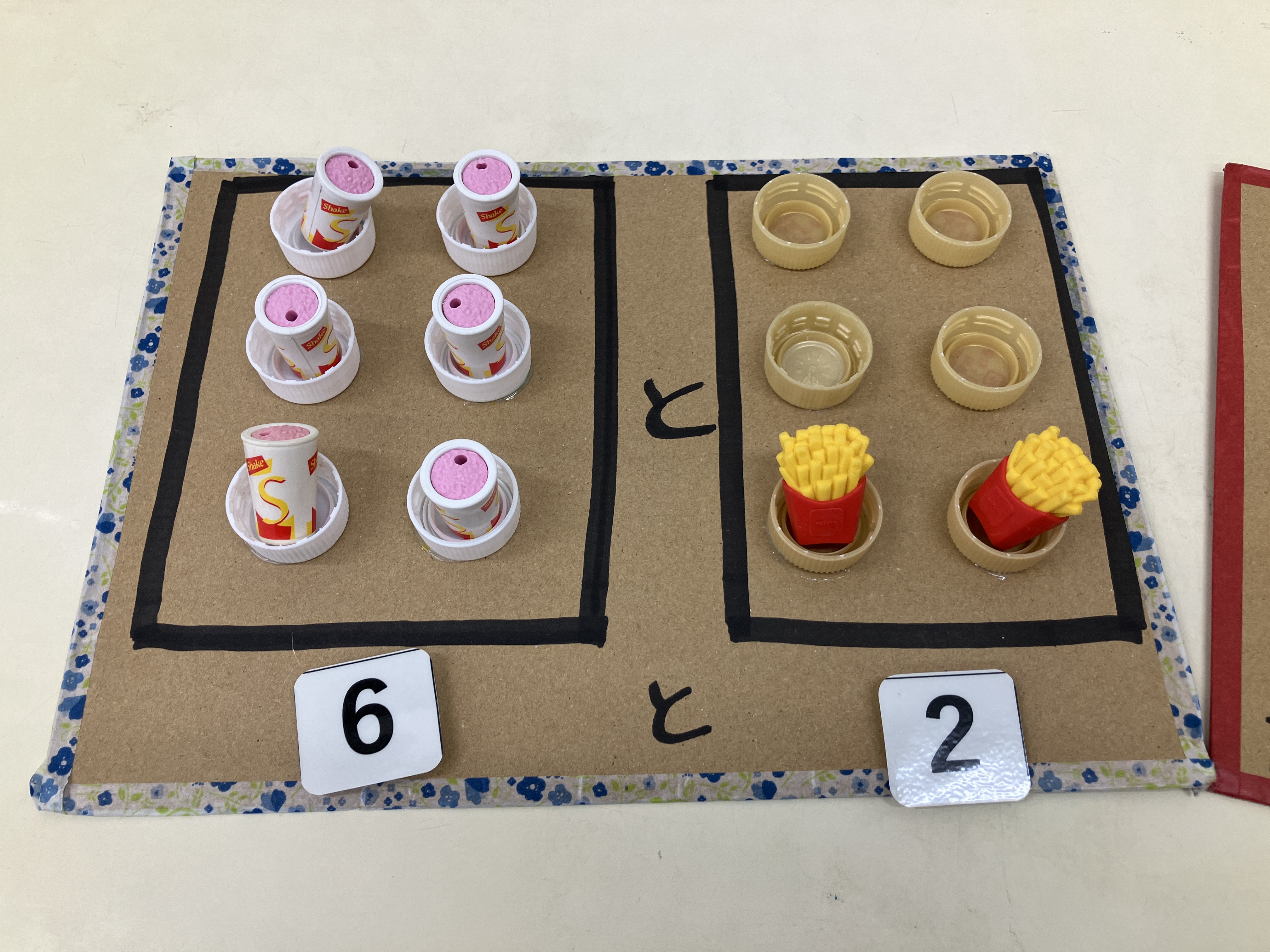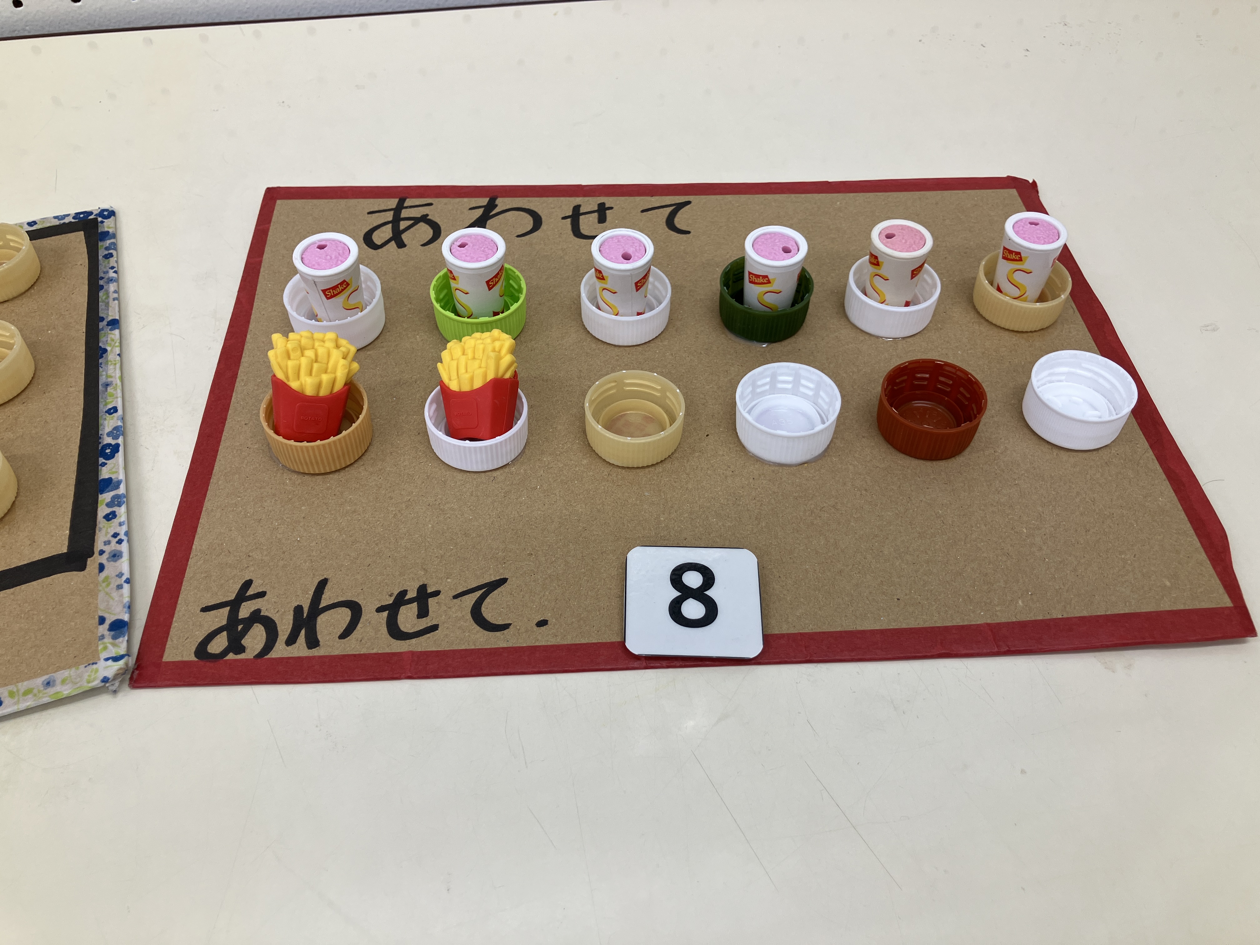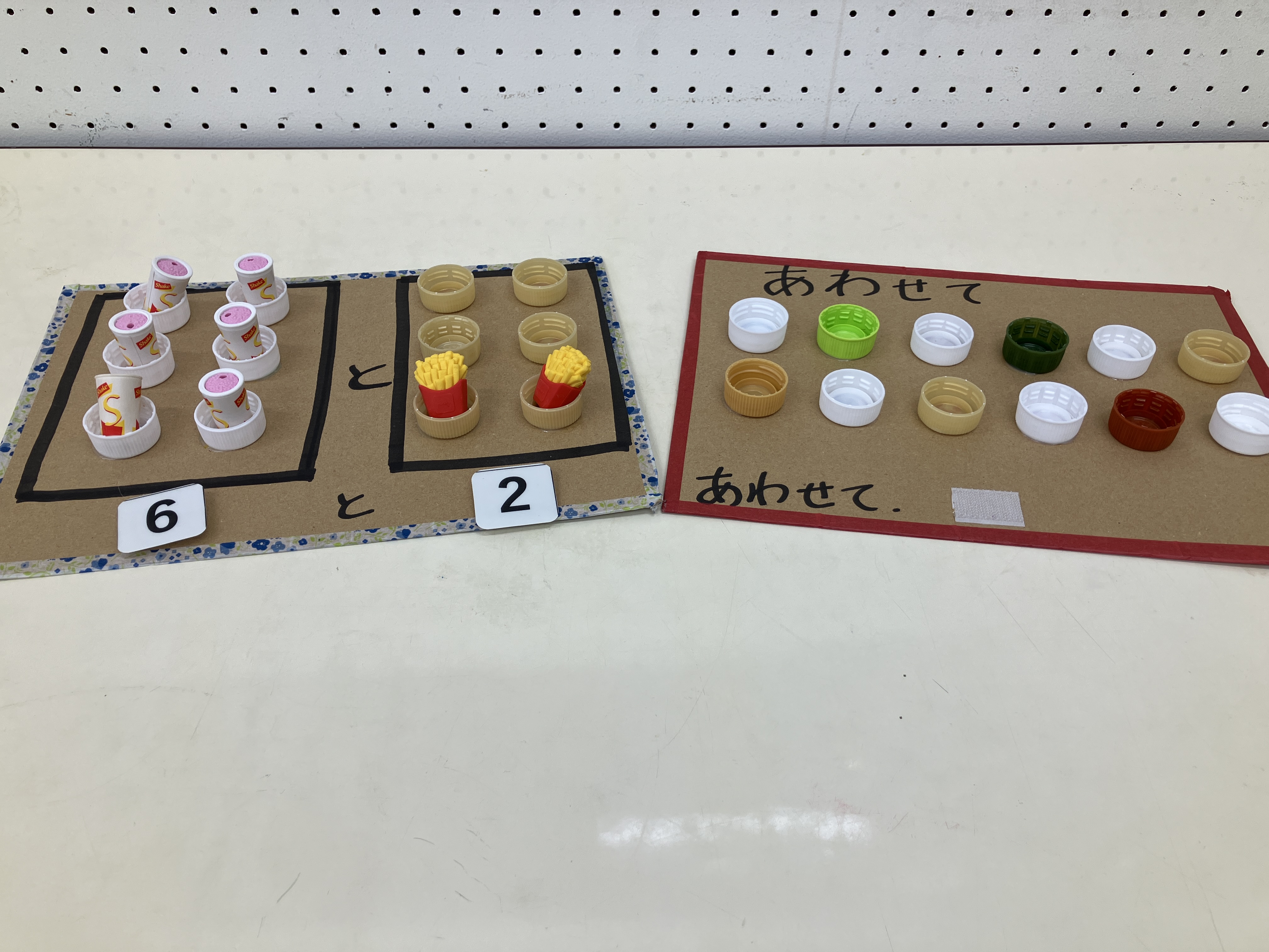 ・数と数量を対応させることができるように、具体物を実際に操作できるようにする。 ・「あわせる」ことが分かるように、書類の違う具体物を使用して、数の合成を行う。 ・具体物を置く場所が分かるように、ペットボトルキャップを土台として使用する。 |