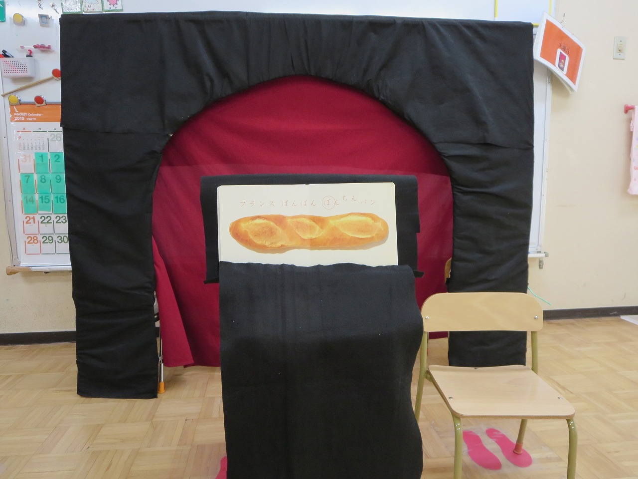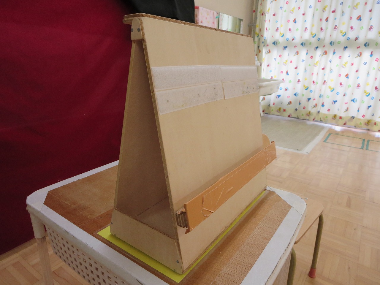 | 使い方 | 底面のない三角柱を木材や丈夫なスチレンボードなどで作る。安定して立つようにスタンド(画像参照)と面ファスナーで着脱できるようにする。また、めくりの歌紙芝居とも面ファスナーで着脱、固定できるようにする。絵本の場合、横棒との間の溝に絵本をはめこみ、ハードカバーの本のページがめくれてしまわずに自立できるようにする。また小型本の場合は三角スタンドに黒いフエルト布や不織布を装着すると一層本への注目が高まる。 |