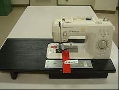 1.縫い進める方向に平行なガイドに沿って布端を合わせることによりガイドから一定の長さが離れた線を縫う。 2.縫う線に垂直な方向上にあり、針のある位置がわかるガイド・・・縫いはじめや縫い終わりを確認する。 3.ガイドの材質:マグネットシートや厚紙など、ミシンの台の上で触ってわかる厚みのあるものが良い。色は弱視の生徒が判別しやすいものを選ぶと良い。 |