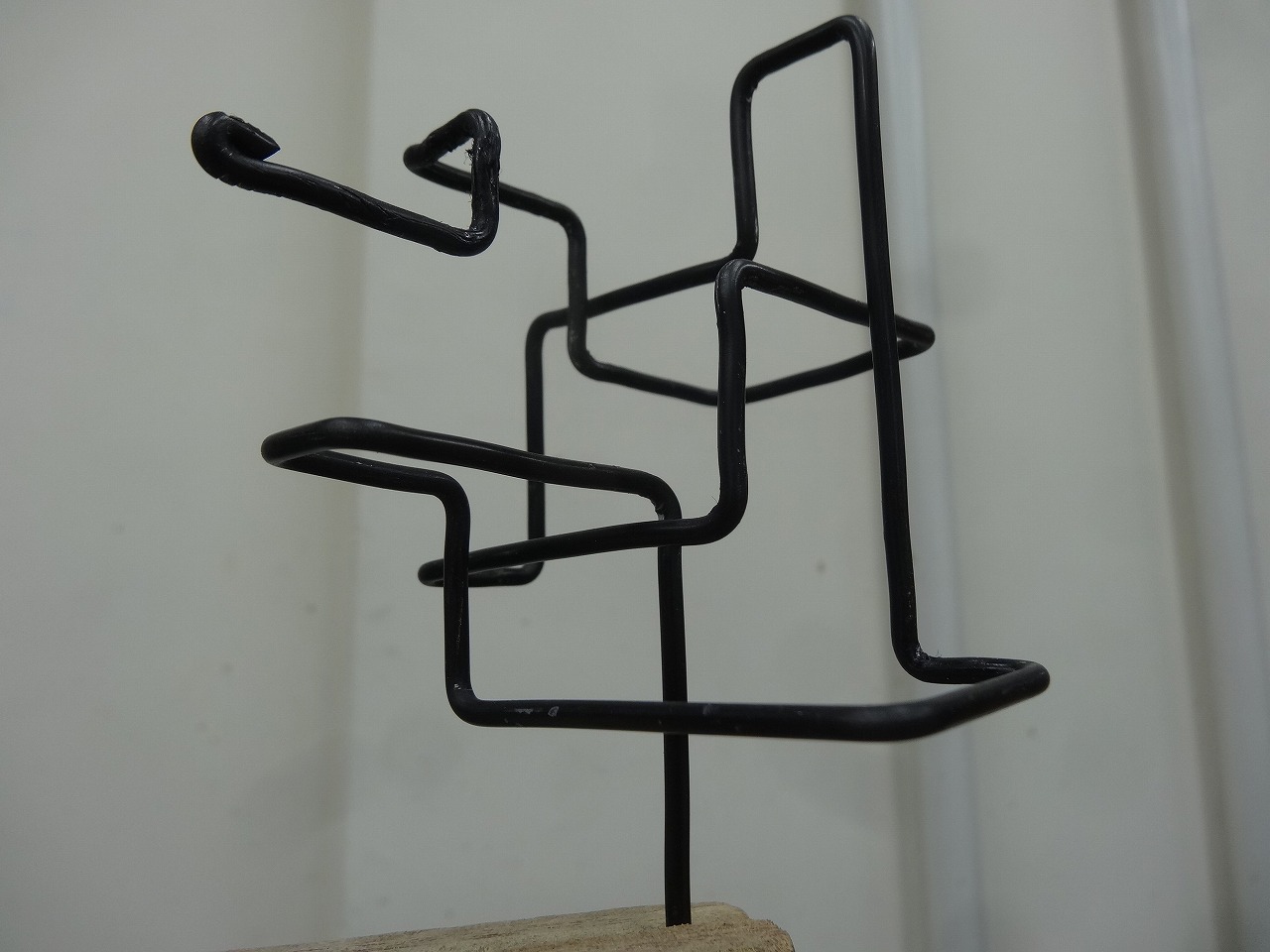 最初真っ直ぐな長い素材を扱うため、作業する生徒間の距離を充分にとるよう配慮する。 安全のため、先端の一方をまず短く折り曲げた上で、もう一方の端からペンチを使って正確に折り曲げていき、角と直線を複合させ、一本の足で立つ空間を取り込んだ立体を作る。 |
