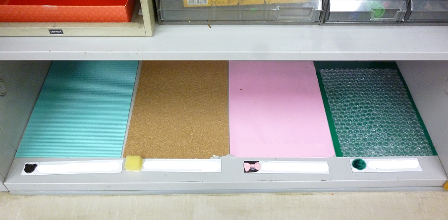・ Mats of mutually different colors and textures were prepared so that children with different levels of eye sight can know where to put their shoes by seeing or/and touching. (In the photo shown above, the materials are, from left to right, one-sided corrugated cardboard, cork, shiny paper and bubble wrap.) ・ The mats were aligned so that it is easy to feel the differences in color and texture. |