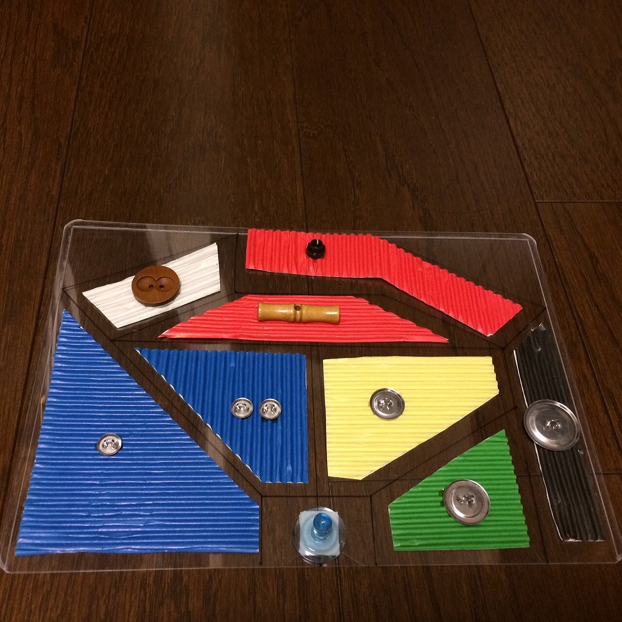 The diagram was prepared so that both students with low vision and those who entirely rely on tactile perception can use. ・ Corrugated cardboards of bright colors were used. ・ Buttons were used to represent instruments. The sizes of the buttons were altered according to the size of each instrument. |