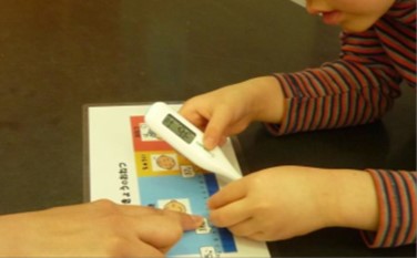 ・Some children who came to understand the meaning of temperature-taking no longer refused to have their temperatures taken. ・Some children began to understand and accept that they could not go outdoors because they had a low-grade fever, even when they were moving around with plenty of energy. ・Some children began to lie down in bed on their own after finding out that they had a fever. ・Some children came to understand how the numbers below the decimal point should be read, and some began to show an interest in these numbers. ・As we continued to use this teaching material every time temperatures were taken, some children began to become aware of the state of their bodies just by hearing or seeing their temperatures. ・Children who claimed to be unwell for psychological reasons and wanted to avoid certain activities became able to change their feelings when the results of the body temperature measurement were shown to them using this teaching material. |