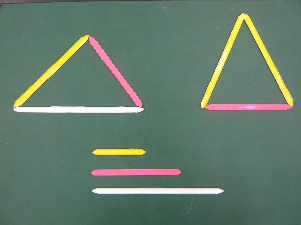 ・平面図形が辺で構成されていることを理解する。 ・2本の辺が合わさったところが頂点であることを理解する。 ・いろいろな長さの棒を組み合わせることで、形が変わることを理解する。 ・自分で棒を動かしたり組み合わせたりして形あそびをすることで、図形に親しみ、理解を深める。 |