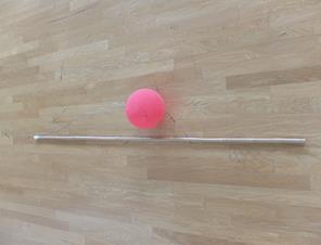 1.釣りの様に竿の先につている風船を児童生徒の打ちやすい(適切な)打点に位置する。 2.ゆっくりと動作を確認しながら正確な打法を習得する。 3.必要に応じて(実践に即した練習のために)、打点を左右上下にずらして打つ練習を行う。 ※紐の長さは竿に紐を巻くことにより調整することが可能 |