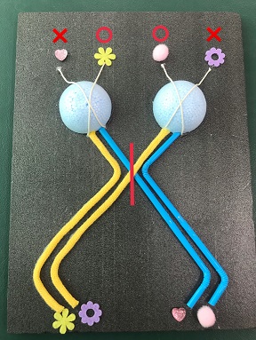 教材全体の素材や色合いに変化をもたし、さらに、凹凸をはっきりさせることで弱視・全盲の生徒がともに理解しやすい教材とした。 視覚の経路をたどることで、その途中のどこかに障害が起きた場合、どこの視野が欠損するかを生徒自身が考え、理解できるよう、視覚の経路の始めと終わりの部分に同じマークをつけた。 |