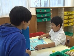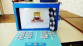 ・教師の合図に合わせて,カーテンを操作する。 ・名詞と動詞を組み合わせて,「~が〇〇する」の文章構成を行う。 ・平仮名文字や片仮名文字を読む。 ・始まりと終わりが分かる。 |