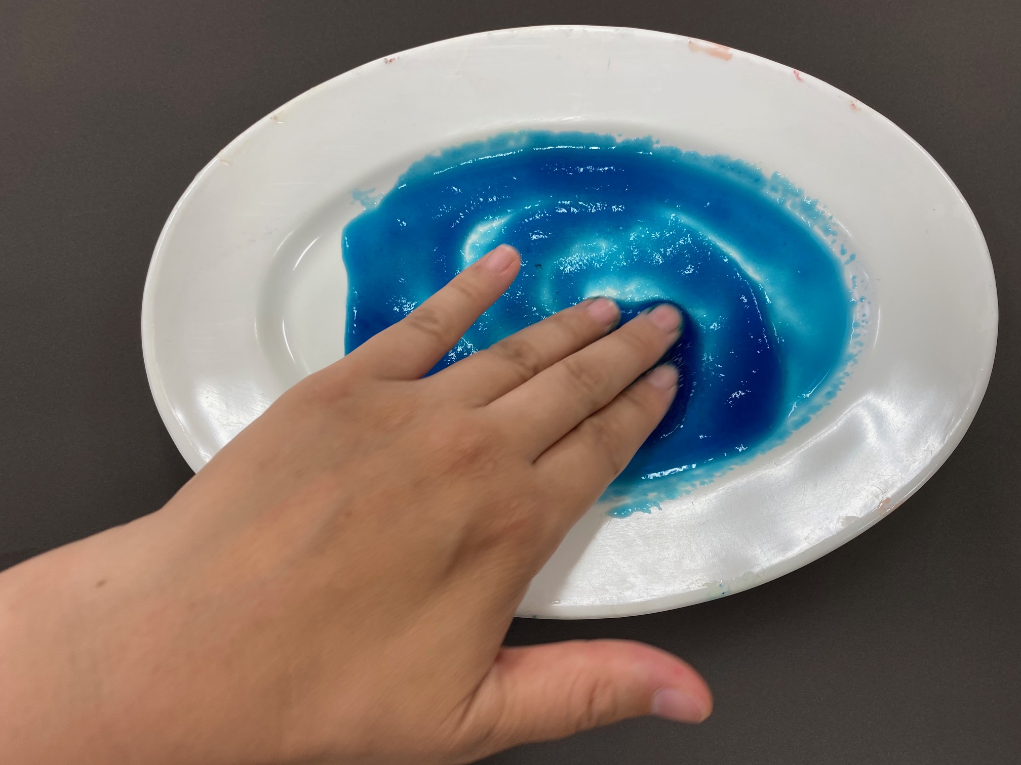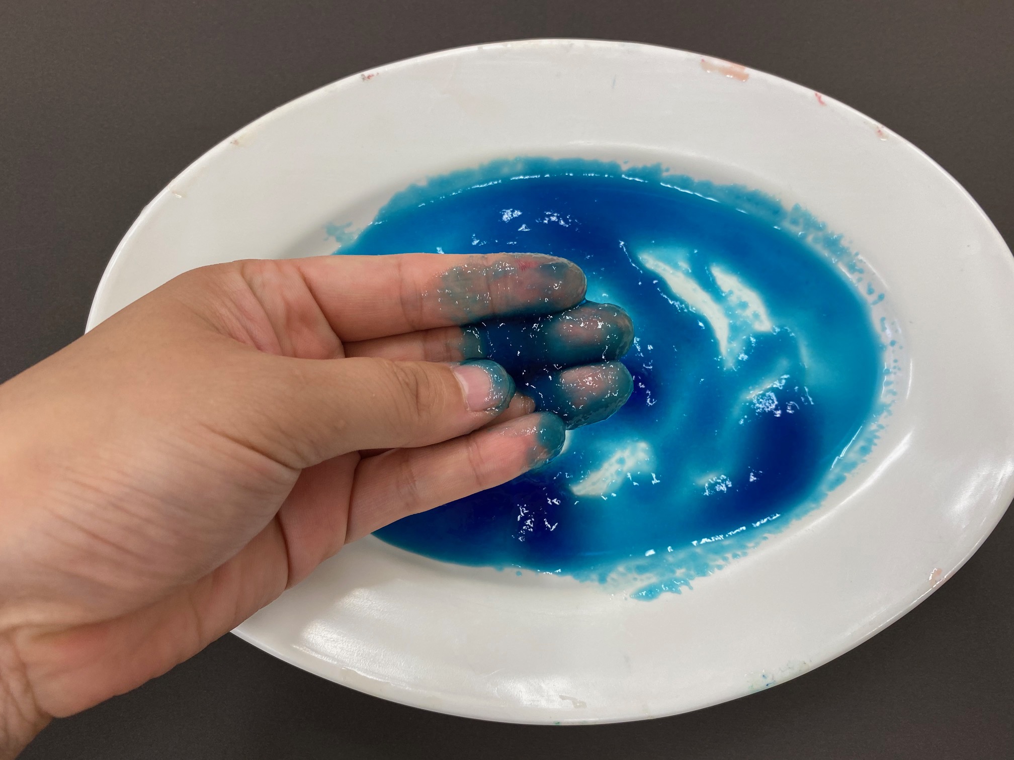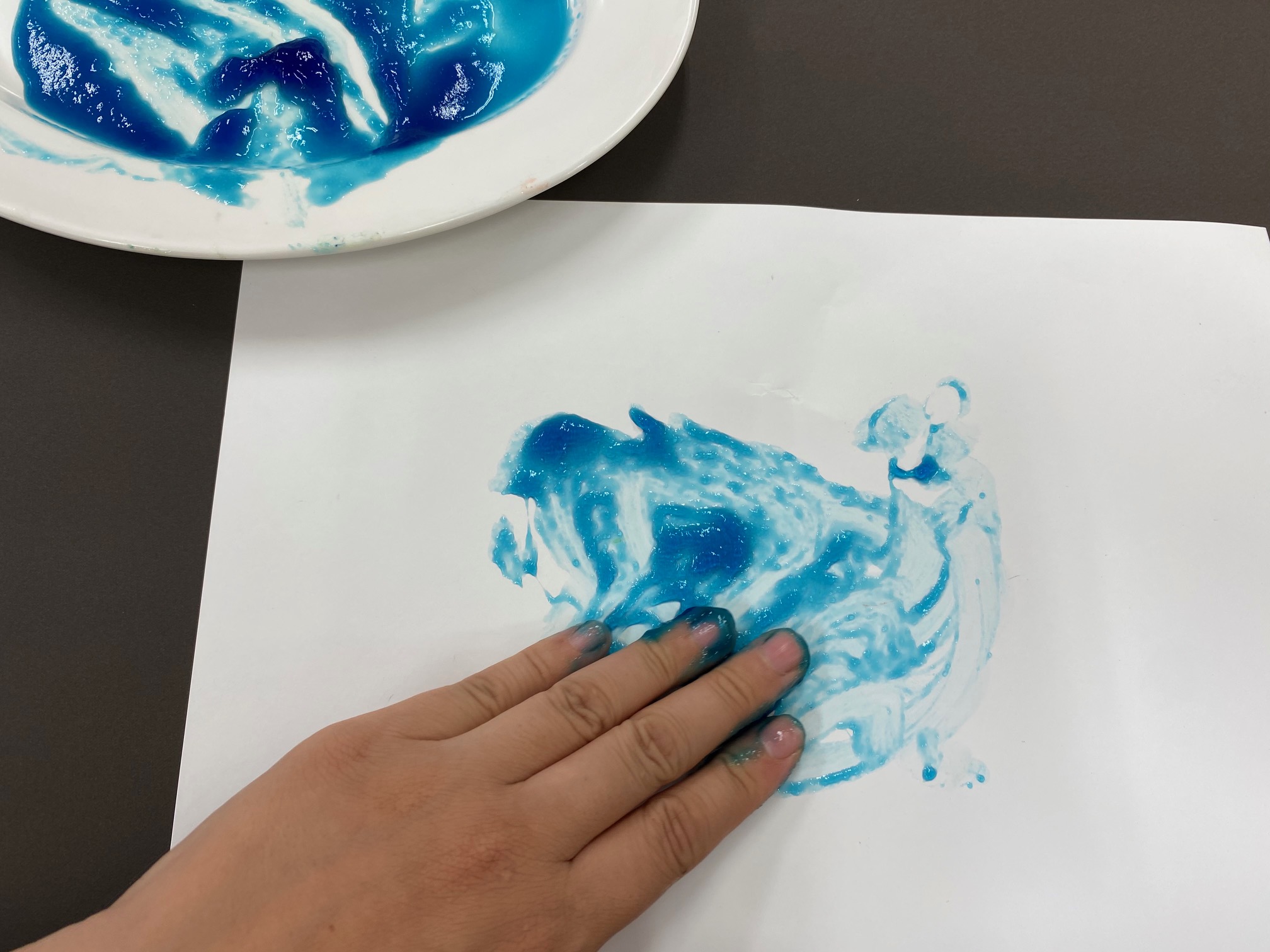 ・取り扱いが簡易かつ安全な素材で指絵の具遊びを楽しむ ・ぬるぬるとした触感を指先等で感じて楽しむ ・色が混ざっていく様子をゆっくり観察する |