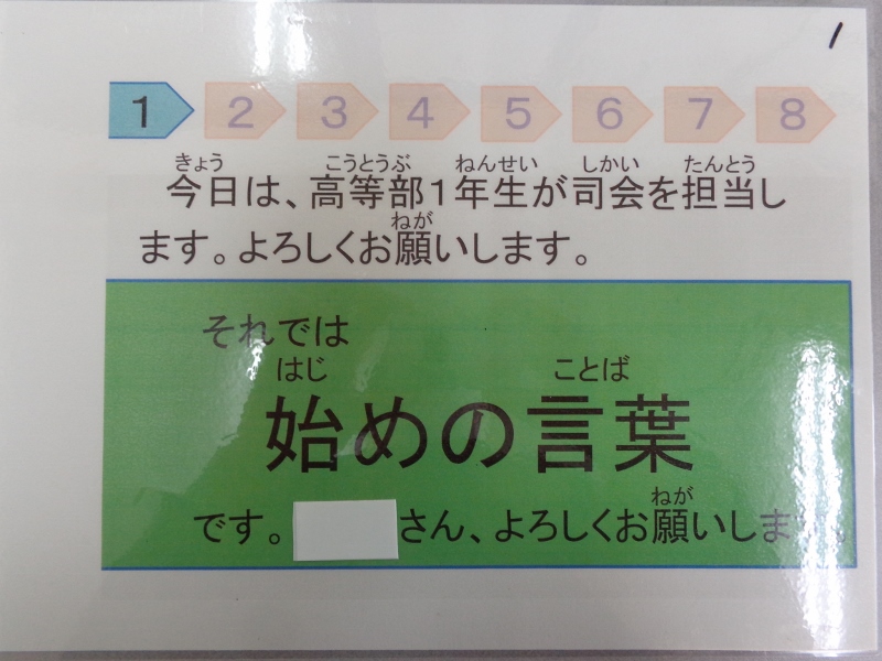 | 障害特性に対する配慮点 | 発語が難しい生徒とそうでない生徒同士が、一緒に進行カードをもとに音声ペンを使用し、司会などの活動を行える。 |
