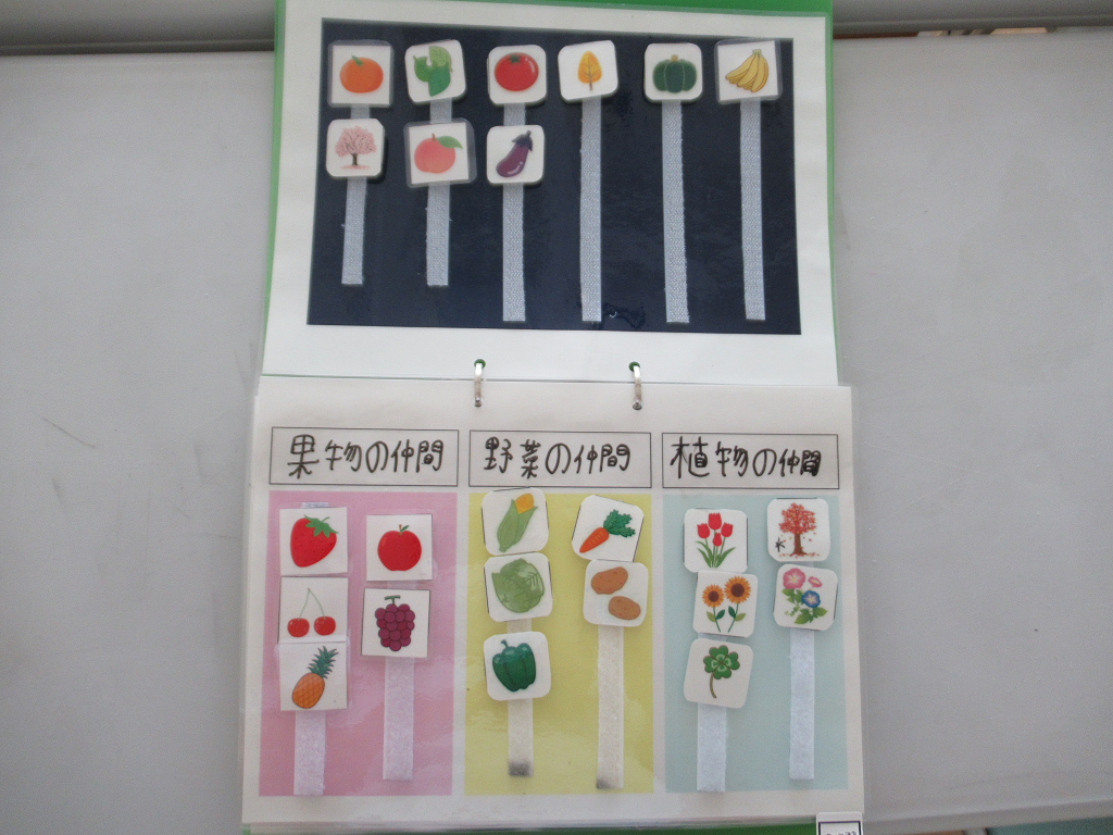 | 障害特性に対する配慮点 | ・絵カードに面ファスナーをつけることで、間違えても簡単にカードを他の場所に移すことができることで、試行錯誤して考えやすい。 |