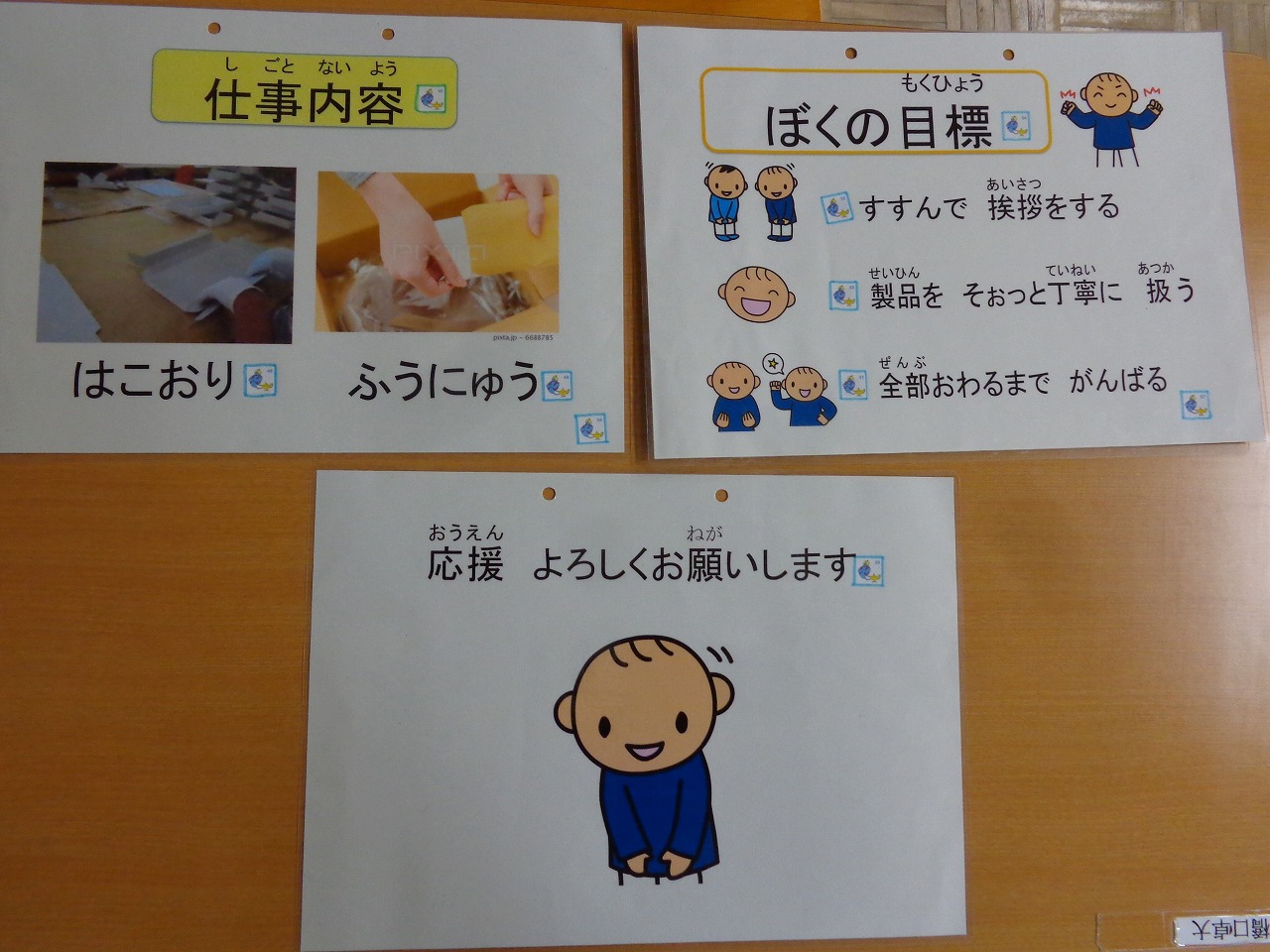 音声ペン(G-Talk:グリットマーク社)、ドットコードシール(グリットマーク社)、実習中の写真 視覚支援シンボル集「ドロップス」のイラストを使用 |