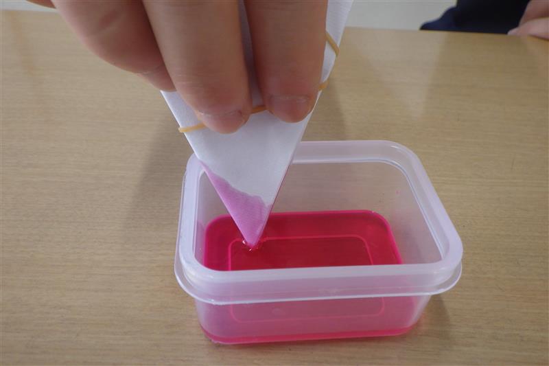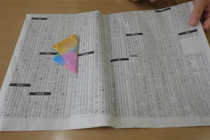 ・染料として、プリンターのインク(今回は、型が合わずに使い道のないものを利用。替えインク等、安価に入手できるもので可。ペン用のインクも使用できるかもしれない)を使用。薄めても発色が良く、よく染み込む。混色する場合は、液体の状態で混ぜると良い(紙の上では混ざりにくい)。絵の具と違い、紙同士がくっついてしまうこともないので、乾いてから開くこともできる。ただし、乾いた後に濡れると滲むので、染めた紙を加工する際には注意が必要。 ・紙は、学習者の実態や、染めた紙をどう使うかにより、使い分けると良い。 ① 天ぷら敷紙:丈夫で破れにくく、広げやすい。ほぼ正方形の程よいサイズで売られているため、切る手間なく手軽に使える。染めた後(濡れた後)、表面がつやっぽくなるため、いわゆる和紙らしさはあまりない。 ② 障子紙:切る手間は生じるが、厚みがあり丈夫なので扱いやすい。和紙らしさも残るので、染めた紙を活用しやすい。 ③ 書き初め用紙:少々破れやすい。乾かしてから広げた方が良いか。 ④ 習字用半紙:手に入りやすく、インクが染み込みやすい。破れやすいので、乾かしてから広げた方がよい。 |