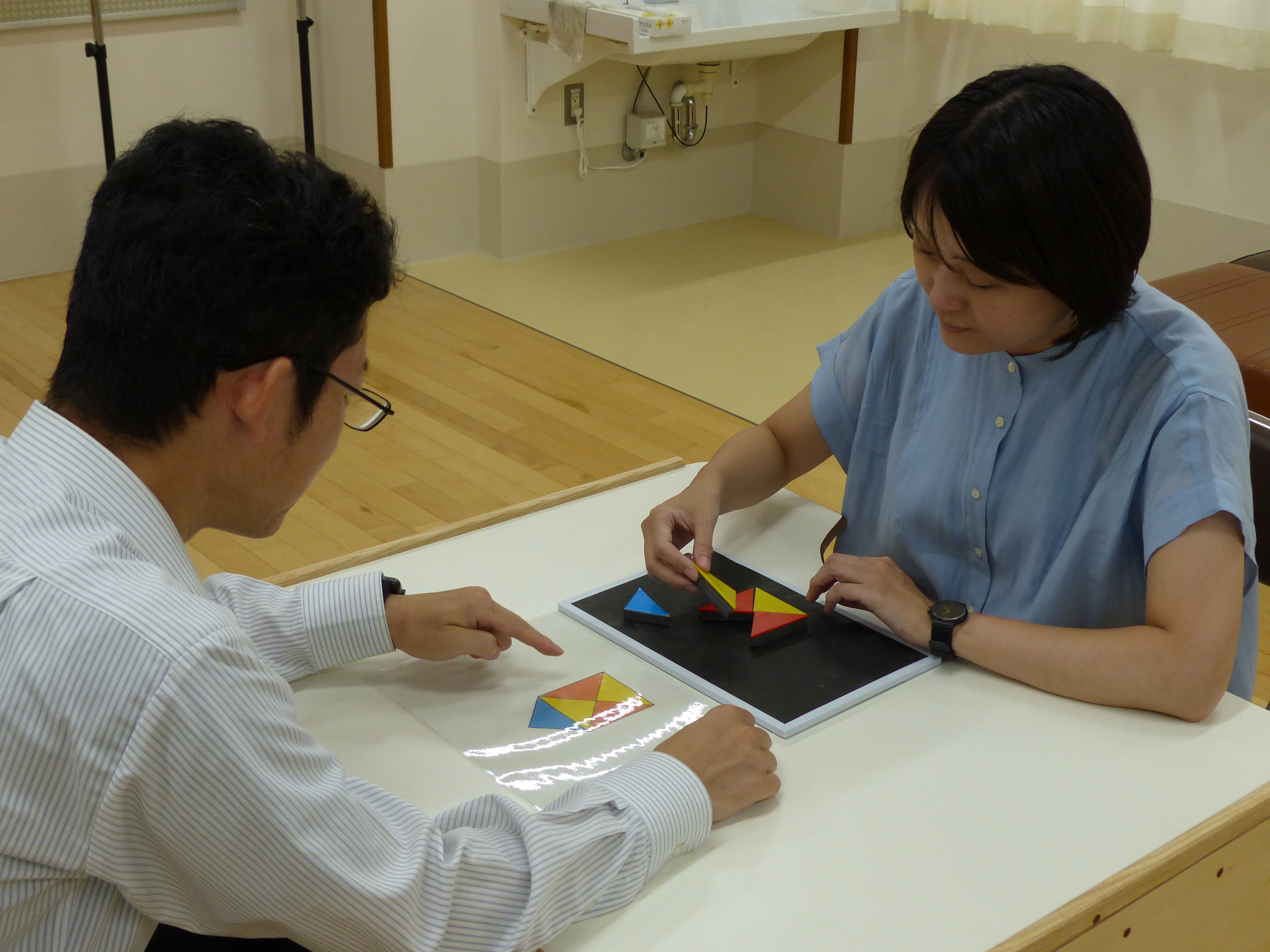 ・手先の細かい操作が苦手なお子さんのために、三角形の色板にスポンジで厚みをつけました。薄い三角形の色板では指先でつまみにくいお子さんでも、自分でつかみ、操作することが可能です。 |