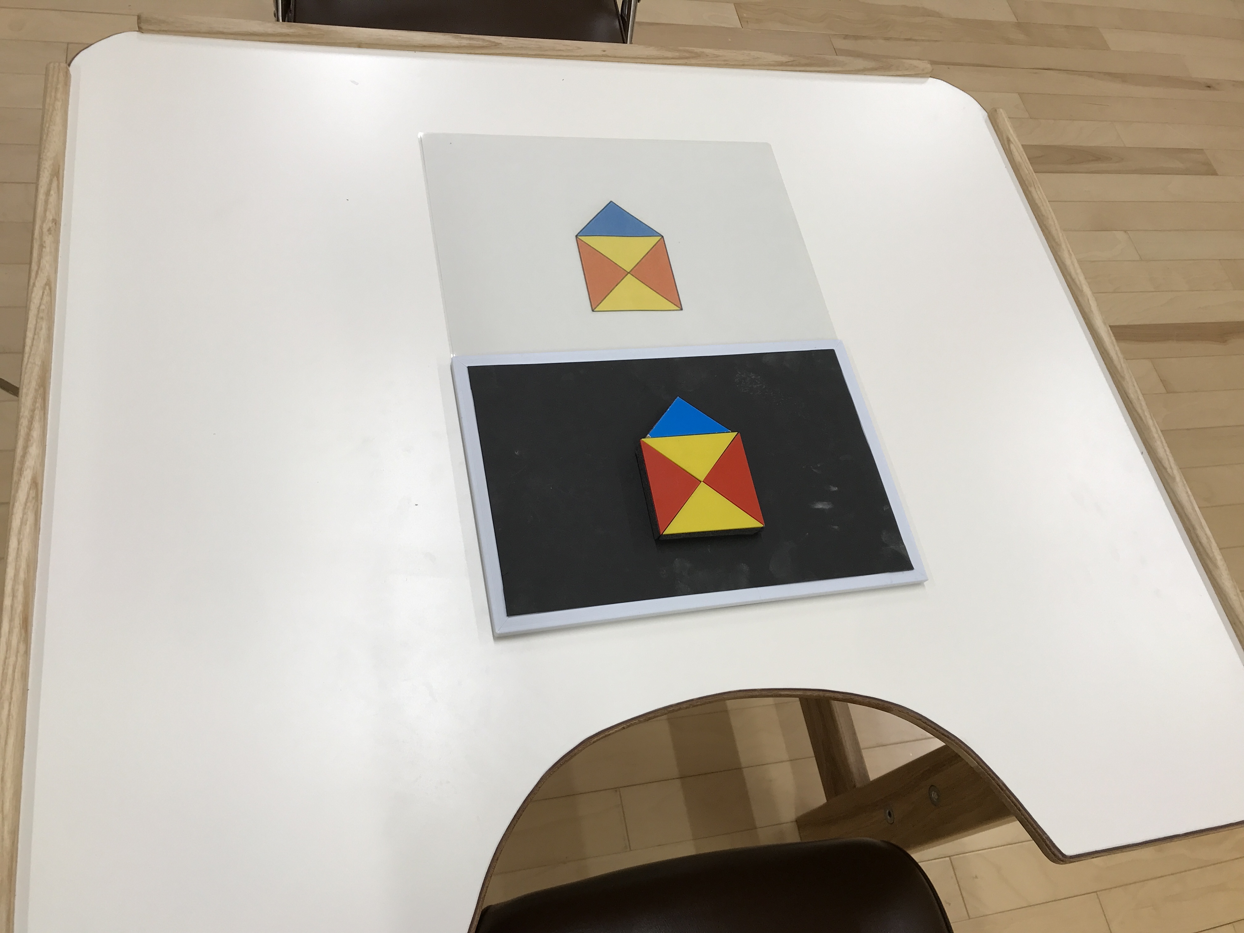 <材料> 〇厚みのある方眼紙、色画用紙 (*市販の算数セットに入っている色板でも代用できます) 〇はさみ 〇のり(*もしくは両面テープ) 〇スポンジ 〇マグネットシート <作り方> ① 方眼紙と色画用紙をハサミで切り取り、のりで貼って、必要な図形(三角形、四角形等)を作ります。算数セットの色板を使うこともできます。 ② 同様にスポンジを切り取り、①と貼り合わせます。 ③ スポンジの裏に、マグネットシートを貼って完成です。 算数・数学の授業で、目的にあわせてご活用ください。 |
