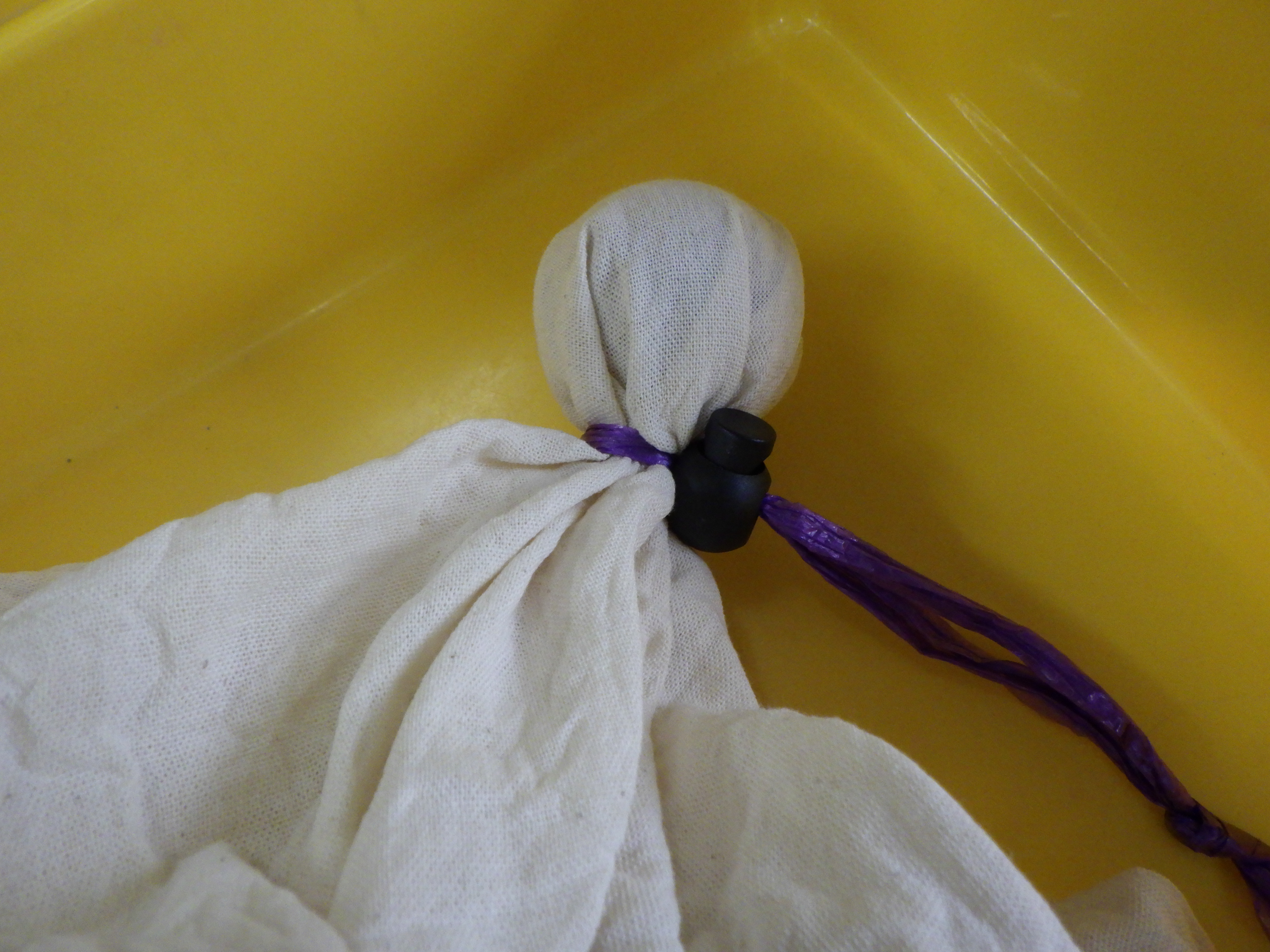 ・輪にした紐にスプリングコードストッパーを通したもの(以下、「キュット」)を作成しておきます。 ・ビー玉などを芯として布で包み、「キュット」の紐の輪をひっかけ、コードストッパーで輪を縮めます。指導者(教員)がコードストッパーの出っ張り部分を押しておき、学習者が紐を引くなど、学習者の実態に応じて使用してください。 ・染液につけ、布を染めます。乾かします。 ・「キュット」を外します。 |