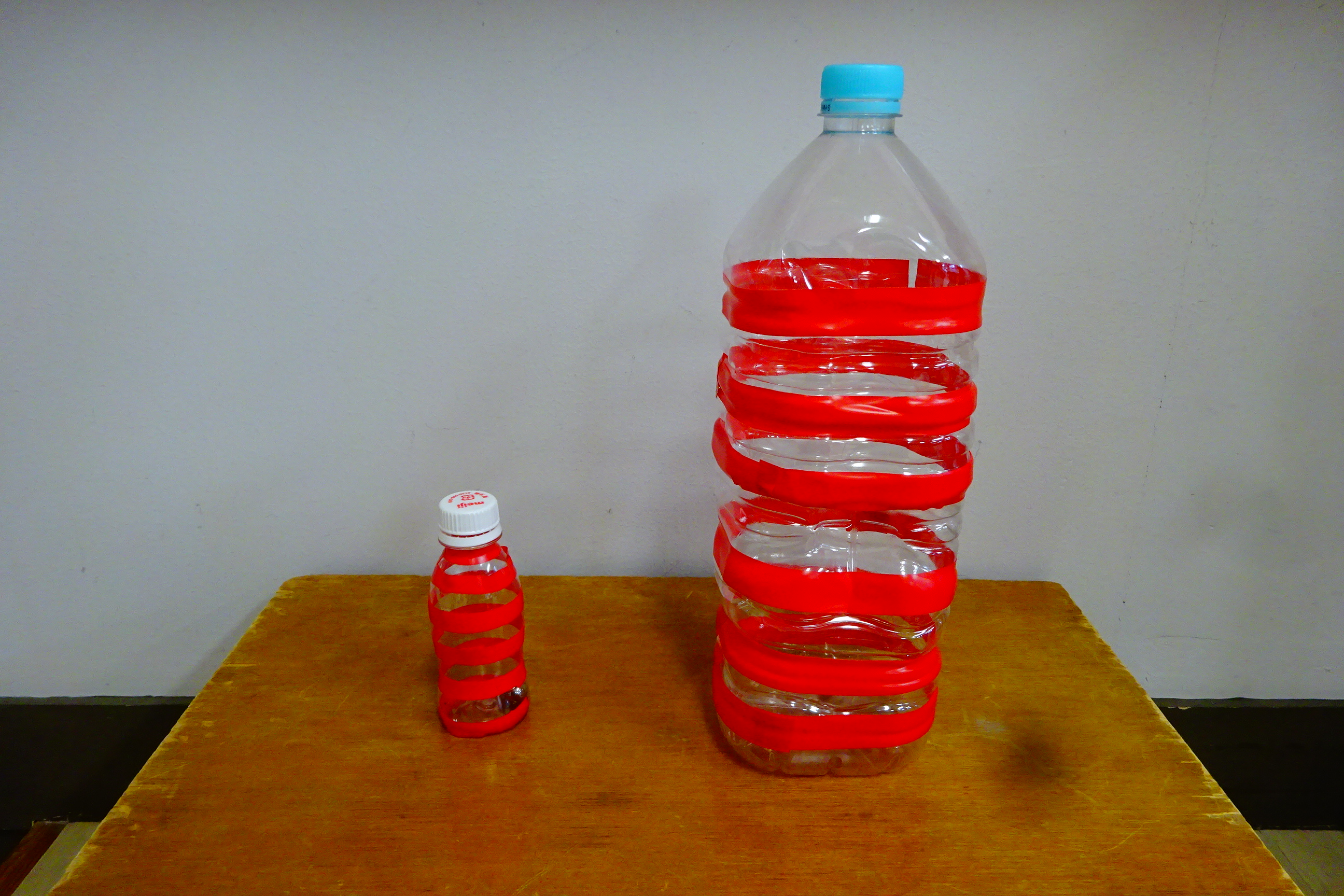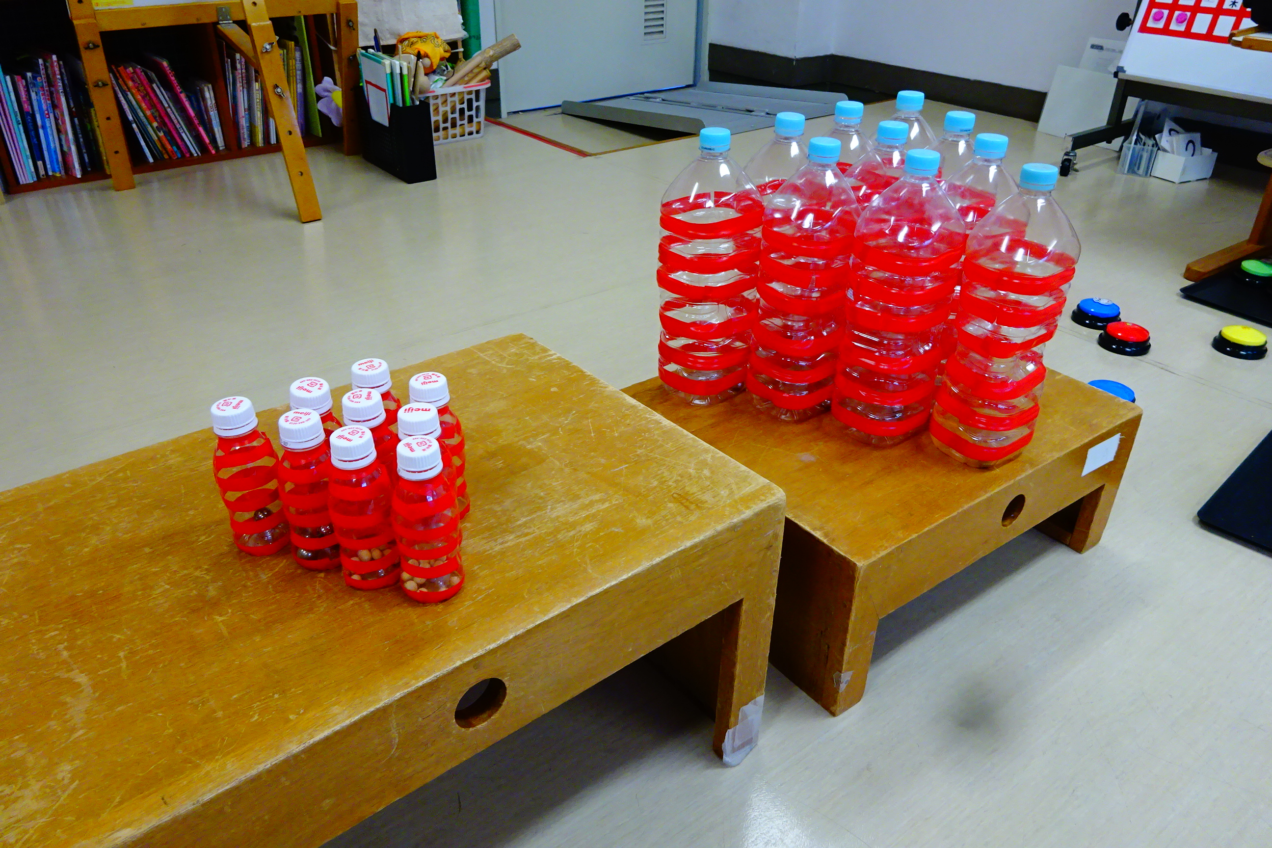 ・操作しやすいように、軽い材質(ペットボトル)を使用した。 ・ものに注目しやすいよう赤い縞模様をテープでつけた。 ・倒れたり、崩れたりしたことが音で分かりやすいように鉛球を中に入れた。 |