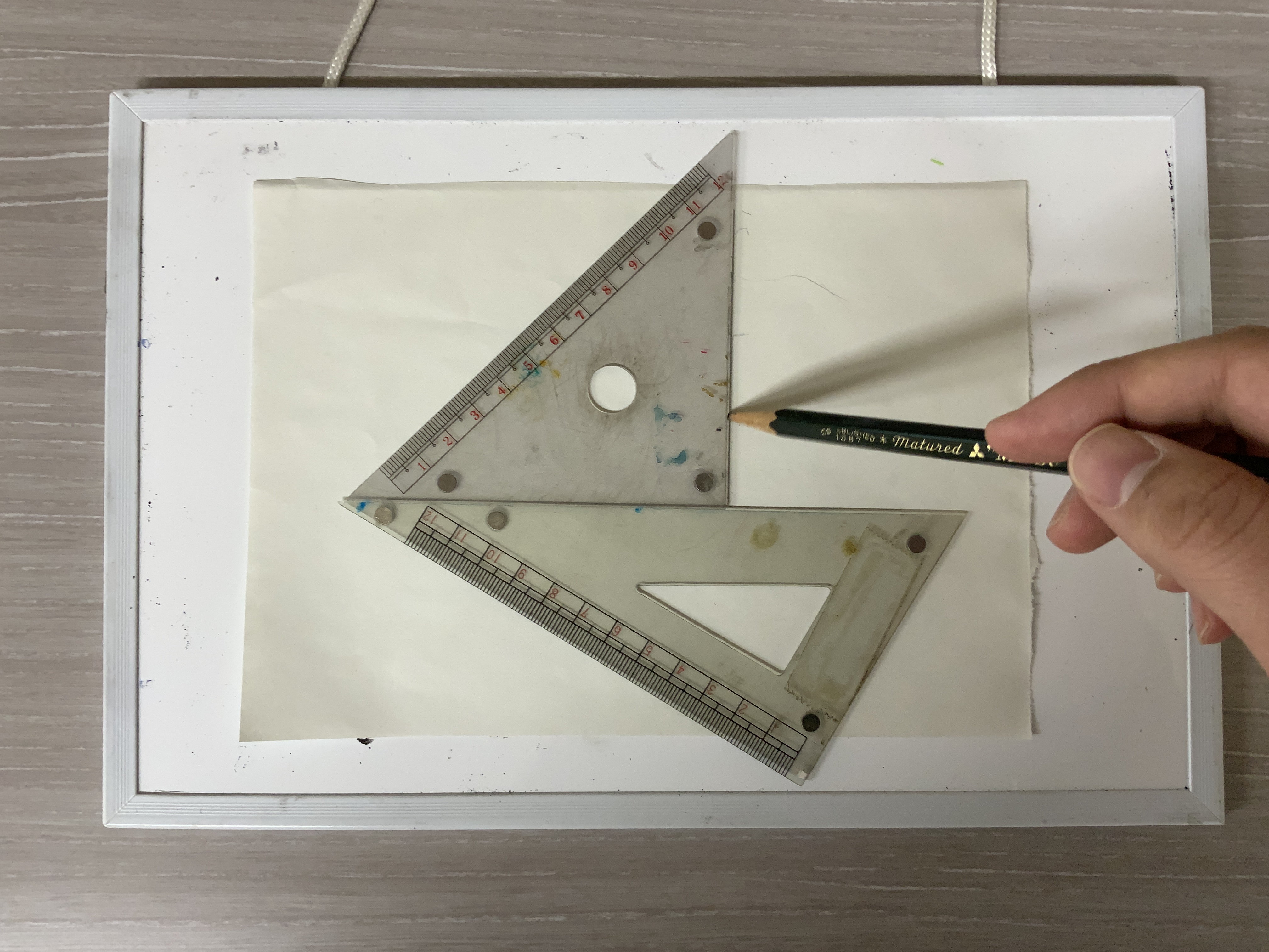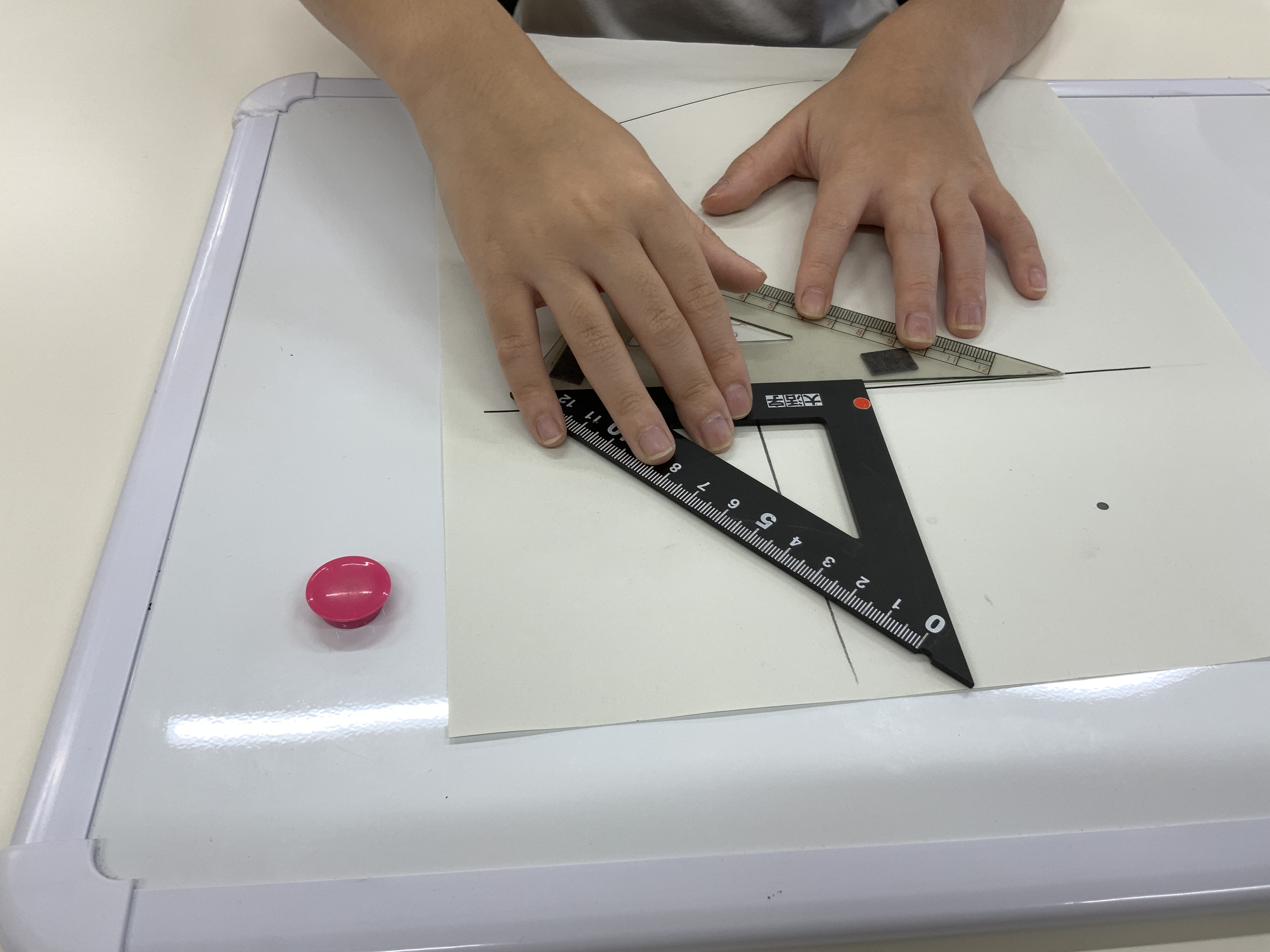 ・磁石を貼ることができるボードに紙をしいて、マグネット三角定規をその上に貼ります。 ・垂直な直線、平行な直線を引く手順に沿って直線を書きます。 |