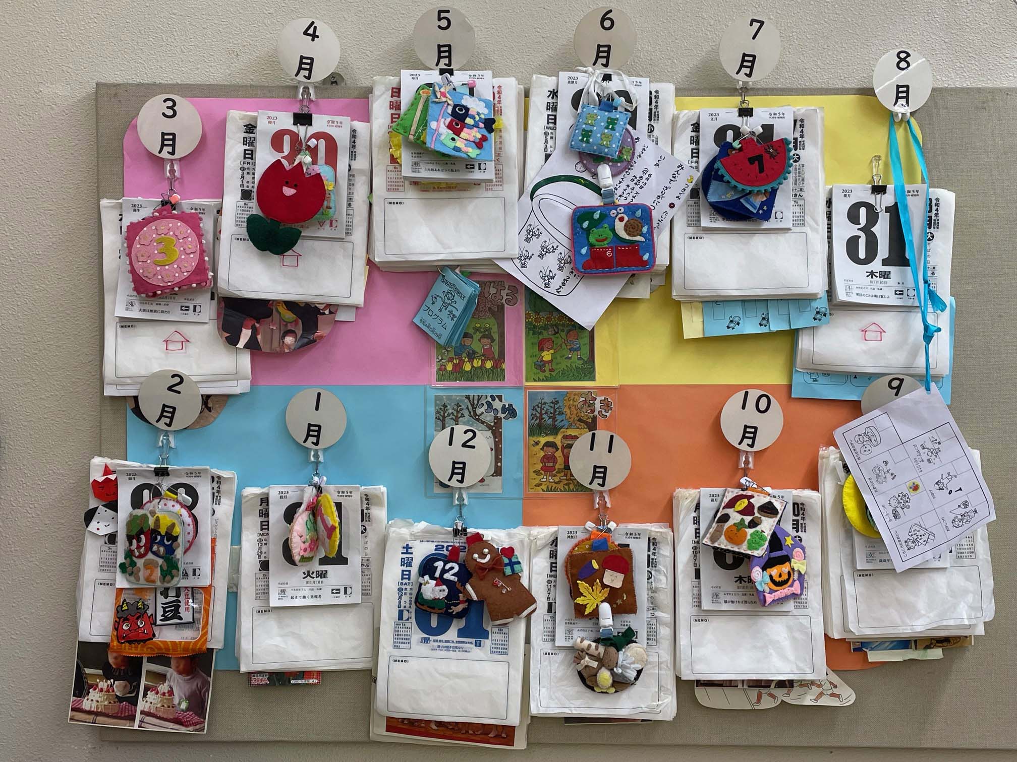➀日々の活動の中で、日めくりカレンダーを幼児と一緒に破ったり、予定や経験についてやりとりしながら、絵や文字で直接書き込んだりする。 ➁毎日幼児と破いて溜まった過去の日めくりカレンダーを、ひと月が終わるごとに、幼児と一緒に振り返りながらまとめる。 ③まとめたカレンダーは、幼児と一緒に掲示する。 (その際に月毎に替わる当番バッジも一緒に掲示する) ④幼児とのやりとりの中で過去の経験を共有したい時や、未来の行事について扱いたい時に、掲示された過去のカレンダーを見ながら振り返る。 |