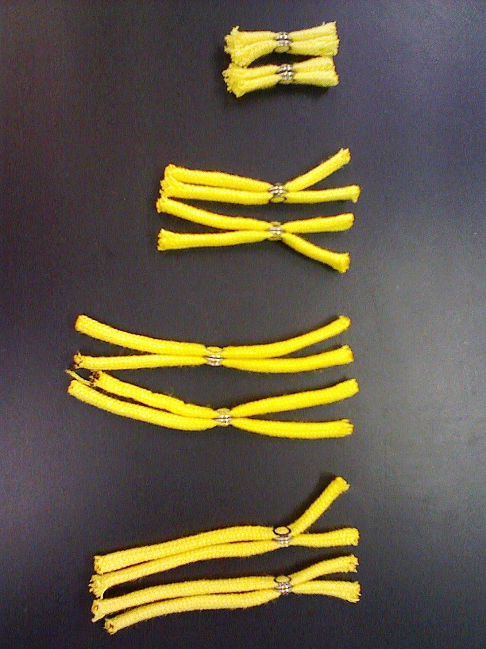 (1) 生徒一人に1セットずつを渡し、染色体を袋から出させる。(隣席の生徒のものと混じってしまったとき、すぐに分けられるように、染色体の模型の色はセットごとにあえて違えてある。なお、相同染色体4対で作ってある。) (2) 「なにか気づいたことはありませんか?」「染色体は何本ですか?」などの発問で、生徒の発見を促す。「1本の染色体はどれですか?」の発問によって、生徒の考えを聞いた上で、「これが1本の染色体です」と示し、さらにそれは細胞分裂直前の、DNAなどの量が2倍になっている状態の染色体であること、また、スナップボタンは動原体を表していることを示す。 (3) 染色体の長さや動原体の位置が同じものが2本ずつあることに気づかせる。生徒が気づいた上で、同じ大きさ・同じ形の染色体を「相同染色体」ということを伝える。 (4) 体細胞中の染色体数は2nで表されることを伝える。 (5) 体細胞分裂の経過で、後期を示すときには、各染色体のスナップボタンを外し、分かれた(染色分体)1本ずつを机の左右に別々に置かせる。 (6) 減数分裂の過程で、第1分裂中期を示すときには、相同染色体をペアにして対合させる。また、第1分裂後期を示すときは、スナップボタンを外さずに相同染色体のペアを解消させ、机の左右に別々に置かせる。この直後に「染色体数が半減するのはいつですか?」と発問する。その後、減数分裂第2分裂後期を示すときに、スナップボタンを外し、分かれた(染色分体)1本ずつを机の奥・手前に別々に置かせる。 ・・・ 以上、使い方の一例を示しましたが、生徒の反応によって発問を変えるので、授業の進め方が少しずつ変わります。また、減数分裂について考えさせるときには、相同染色体どうしをペアにさせずに「2n=8をn=4にするには、どのように4本ずつに分けたらよいか?」と発問して授業を進めます。手元の染色体模型を触りながら考え、意見を出し合い話し合わせることで、等質に二分するためには相同染色体のペアを解消し分けることが必要であることが自ずとわかってきます。 |