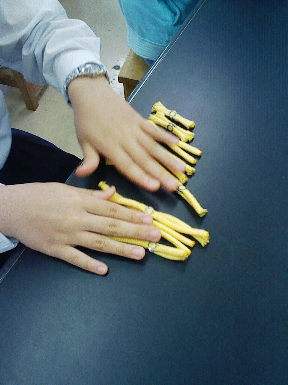 視覚に障害のある生徒が動画で確認できない内容を、手元の模型を用いて学習するための物。触図のみでは伝えられない内容について、この模型を生徒自身が手で触り、染色体の動きを知り、細胞分裂のようす、体細胞分裂と減数分裂の違い、減数分裂の意義などについて学習します。 そのためには、生徒一人に1セットずつを用意することが肝要です。 最初から教え込むのではなく、生徒に模型を触らせながら、教員は問いかけ、生徒の考えを引き出し、意見をまとめながら、解説は最後にするとよいでしょう。 |