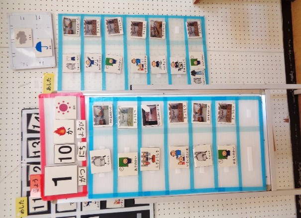 ・「今日」と「明日」の違いが分かるように、色を分け、予定ボードの場所も分けて設置した。 ・予定ボードを「剥がす」、「貼る」といった目で見て分かる動きを通して、「今日」が終わると「明日」になるということに気付けるように、予定ボードを簡単に貼り替えることができるようにした。 |