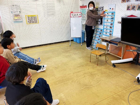 ・帰り会で繰り返し取り組むことで、教師が予定ボードを操作している姿を見て、児童も主体的に予定ボードを貼り替えるようになる。 ・貼り替える動きを通して、「今日」と「明日」の移り変わりに気付 くとともに、一日の活動を示す予定ボードに注目しやすくなる。 |