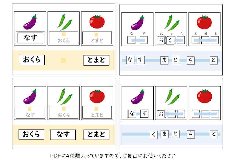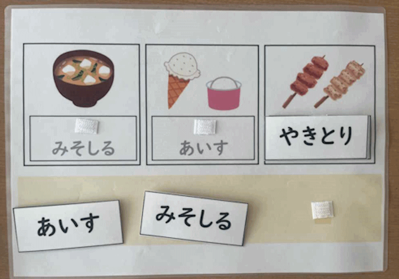 ・最初に、身近な物の名前を「単語のまとまり」で捉える。 単語のまとまりで覚えた後に、その単語は一つ一つの文字で構成されていることを学習するようにする。 ・見ずに貼るなどの誤学習が起こりやすいため、注目を促して正答していることをこまめに称賛しながら、エラーレスで取り組むようにする。 |