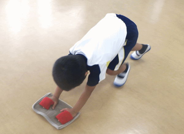 ・床に置き、手を入れたらスタートできる。 ・体幹が不安定な子どもには膝をついた姿勢で練習をする。 ・スピードを出して競争もできる。 ・くま歩きなら進める子には、片手ずつに分割して使用してもよい。 |