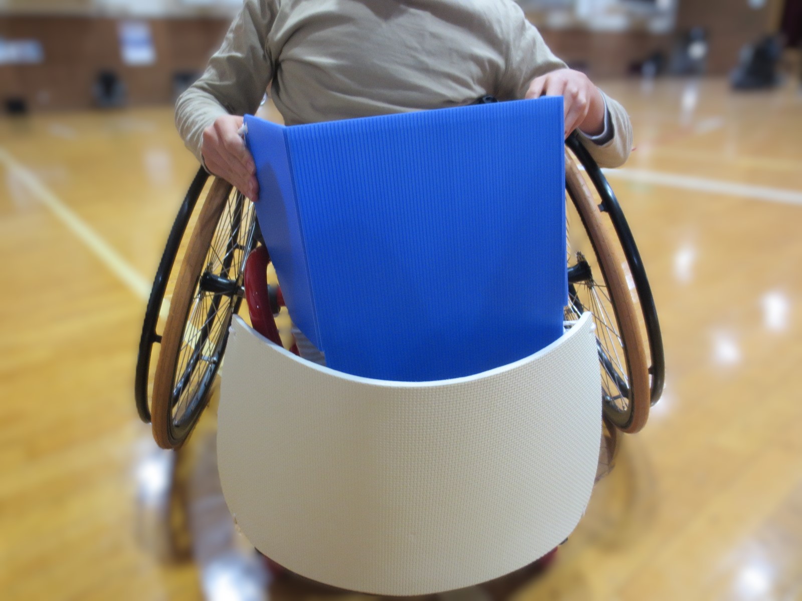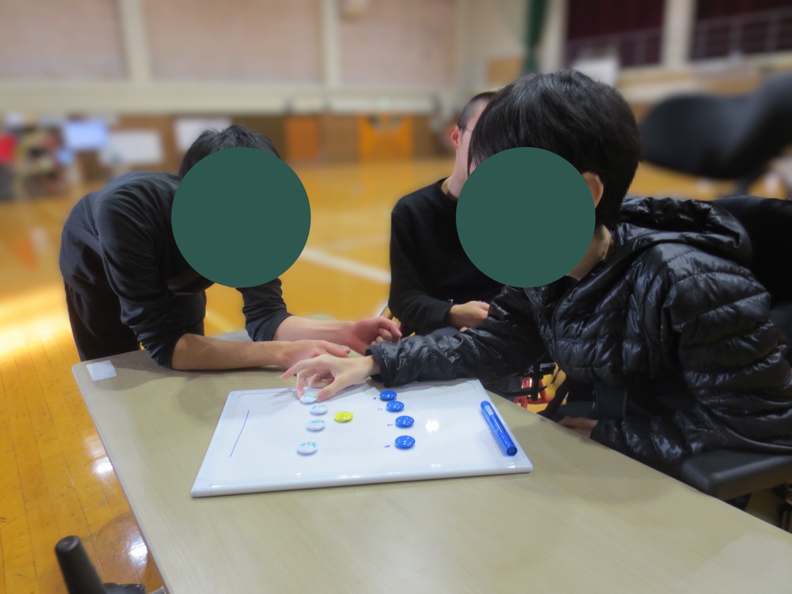 ・空間の認知が難しい生徒でも、全体のポジションを平面のボード上で確認できるため、相手の陣形や動きを確認しながら攻防の作戦を考えることができます。平面上で動きを確認→実際にコート上で動く→再度、平面上で動きを確認する、という流れで学習することによって、空間把握がしやすくなります。 ・障害が重い生徒でも、安心してゲームに参加することができるように、「強くぶつかりあうタックル」の代わりに、「相手の身体に触れるタッチ」をするというルールに置き替えています。 ・車いすにのっている生徒は足の怪我を防ぐため、足の部分にガードをつけています。 |