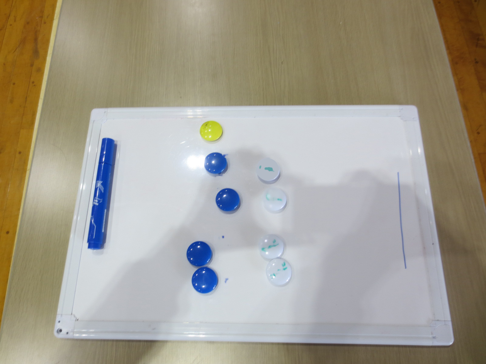【本指導法に必要な材料】 ・ミニホワイトボード(100円均一ショップで販売しているもの) ・マグネット(プレーする人数分 青と白の2種類あると使いやすいです。青は敵陣、白は自陣のコマとして使用します。白のマグネットには、自陣の生徒の名前を記入してください。) ・マジック ・ノートPCと大型モニター(既習事項の復習、生徒のコメントを映すため。ノートPCとモニターを接続して使用します) <授業の一例> ・挨拶、体調確認の後、ウォーミングアップを入念に行います。ウォーミングアップは生徒の実態により、調整してください。 ・前の時間の復習をします。 *前時間のゲーム内容について、写真や互いのコメントをモニターで見て、気付いたことを述べたり、他者の意見に耳を傾けたりしながら、振り返りをします。指導者は必要に応じて声かけをしますが、生徒自身が主体的に話し合いを進められるようにします。 *生徒が話し合いをしているときに、指導者が車いすにガードをつけます。 ・2チームに分かれて、作戦を立てます。長机にホワイトボードを置き、自陣と敵陣に見立てたフォーメーションの位置にマグネットを置きます。マグネットを動かし、マジックで矢印を書きながら、攻撃と守備のシミュレーションをします。生徒が作戦を立てているとき、指導者は見守りを心がけますが、話し合いに参加していない生徒がいないかを目配りし、ねらいに沿った話し合いができるように適宜サポートします。 ・実際のコートでゲームをします。 ・ゲーム後に、再びチームごとに集まってプレーの振り返りをします。 |