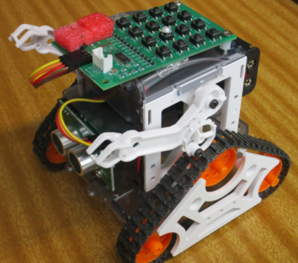 ・考案者:福岡工業大学 情報工学部 情報システム工学科 木室義彦 研究室 http://www.fit.ac.jp/~kimuro/ ・使用教材・部品: TAMIYA マイコンロボット工作セット(クローラータイプ) アイロジック I2C接続4x4キーパッド |