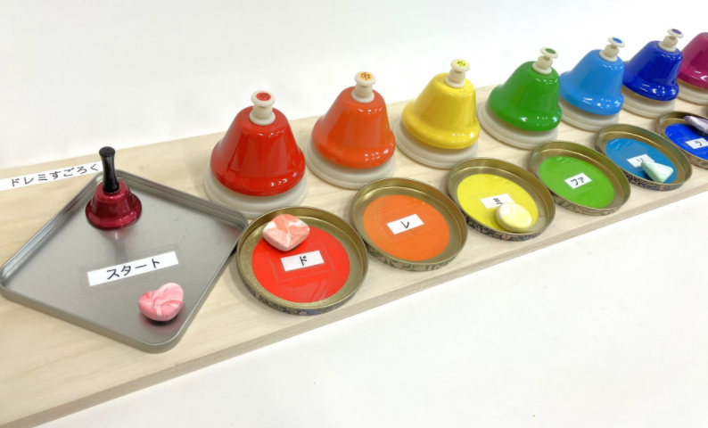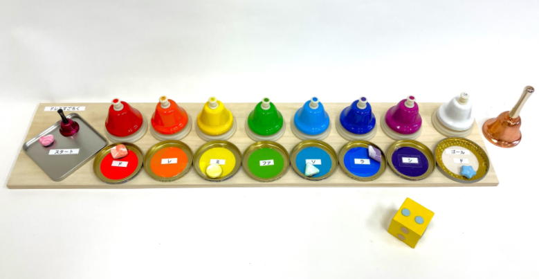 1. ゲームの参加者で声出しジャンケンをしてコマの選定、サイコロを転がす順番決めをする。 2. 自分のコマをスタートのマスにセットし、友だちのコマの形や色を確認する。 3. 小さなベルを振って「ドレミすごろく始まるよ!!」と音でゲームの開始を知らせる。 4. 1番目の児童が鈴の入ったサイコロをふり、出た目の数を言葉で伝える。サイコロの目が「2」の場合は、スタートから自分のコマを探し、「ド・レ」と自分のコマを2マス進め、「レ」のマスに置く。マスの奥にある「レ」のベルを鳴らしてコマの位置を音で伝える。 5. 同様に2番手・3番手もサイコロを振り、出た目の数だけマスを進め、ベルを鳴らす。これらを繰り返し、最初にゴールした人が優勝となるが、全員がゴールするまでゲームは継続する。 6. 全員がゴールした後、優勝した児童は、ハンドベルで得意な曲(カエルの歌・チューリップ・ドレミの歌等)を披露する。 |
